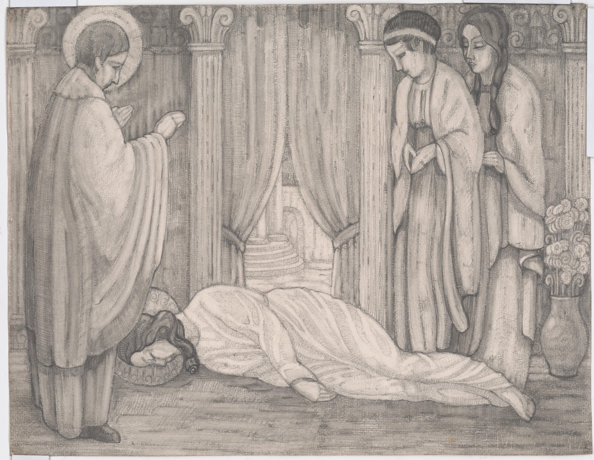Ce travail préparatoire a été réalisé par Marcel Poncet en 1915 pour le vitrail dédié à sainte Cécile (GE_08.12), situé dans le bas-côté sud-est de l'église Saint-Paul de Cologny (GE), dans le quartier de Grange-Canal. Il correspond à la partie inférieure du vitrail, représentant la mort de sainte Cécile, bénie par l'évêque Urbain à qui elle a demandé de consacrer une église sur le lieu de sa mort, dans sa maison (Voragine, 1910, p. 639-644).