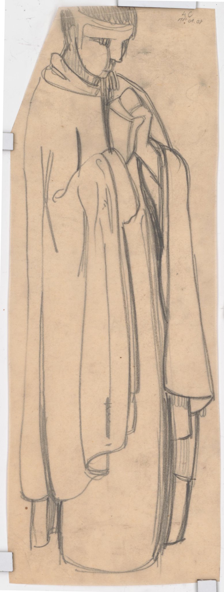 Ce travail préparatoire a été réalisé par Marcel Poncet en 1915 pour le vitrail dédié à sainte Cécile (GE_08.12), situé dans le bas-côté sud-est de l'église Saint-Paul de Cologny (GE), dans le quartier de Grange-Canal. l correspond probablement à l'un des personnages de la partie médiane du vitrail, représentant le martyre de sainte Cécile plongée dans un bain d'eau bouillante, après qu'elle ait refusé de sacrifier aux idoles. Elle y reste cependant comme dans un lieu frais, sans qu'aucune goutte de sueur ne se voie sur elle (Voragine, 1910, p. 639-644).