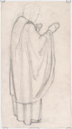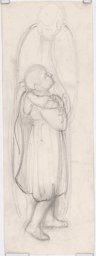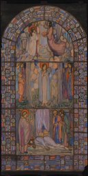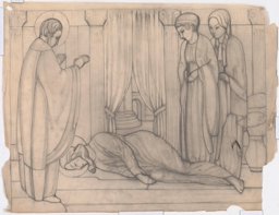 Ce travail préparatoire a été réalisé par Marcel Poncet en 1915 pour le vitrail dédié à sainte Cécile (GE_08.12), situé dans le bas-côté sud-est de l'église Saint-Paul de Cologny (GE), dans le quartier de Grange-Canal. Il correspond à la partie inférieure du vitrail, représentant la mort de sainte Cécile, bénie par l'évêque Urbain à qui elle a demandé de consacrer une église sur le lieu de sa mort, dans sa maison (Voragine, 1910, p. 639-644).