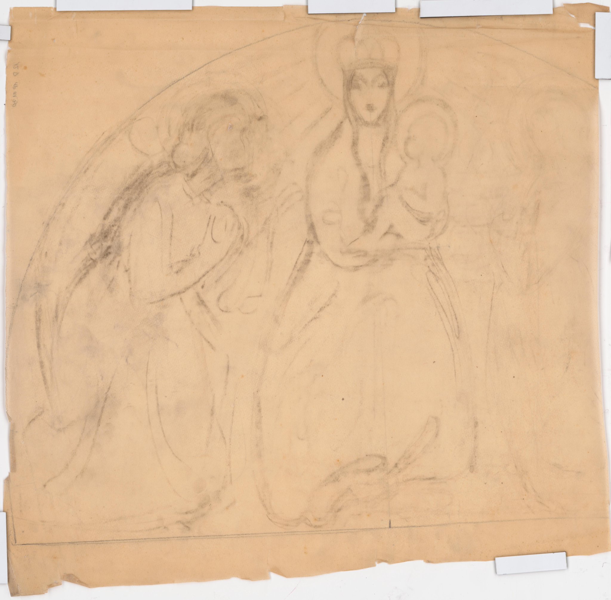 Plus de 70 projets peuvent être rattachés aux vitraux de Saint-Paul, et 51 aux trois vitraux des bas-côtés, mais l’ensemble n’est probablement pas complet. Pour le vitrail de la Vierge, il existe 21 oeuvres graphiques, dont sept esquisses qui peuvent être rattachées à la scène supérieure (MP_01.31 ; MP_01.32 ; MP_01.33 ; MP_01.34 ; MP_01.35 ; MP_01.67). Cette esquisse est probablement parmi les premières qu'il réalise pour cette scène, dans laquelle il définit les grandes lignes de sa composition. La comparaison avec le vitrail montre qu'il diminuera la taille de la Vierge pour laisser plus de place à la représentation de l'espace céleste autour d'elle, et qu'il modifiera considérablement, en le stylisant, l'ange de gauche. Une fois ses personnages et sa composition fixée, Poncet réfléchit sur d'autres projets au positionnement du futur réseau de plombs (MP_01.34), et même au travail de la grisaille pour créer la texture et des jeux d'ombre et de lumière sur les nuages et les tissus (MP_01.35).