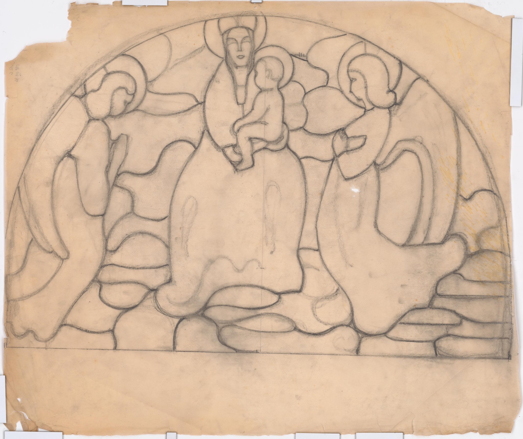 Ce travail préparatoire a été réalisé par Marcel Poncet en 1915 pour le vitrail dédié à la Vierge (GE_08.10), situé dans le bas-côté sud-est de l'église Saint-Paul de Cologny (GE), dans le quartier de Grange-Canal. Il correspond à la partie supérieure du vitrail dédié à Marie, représentant la Vierge à l'enfant en gloire dans le ciel.