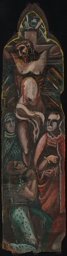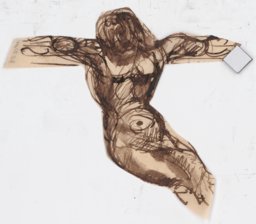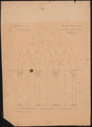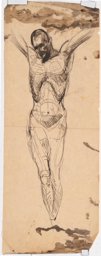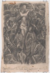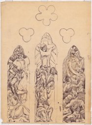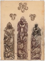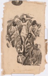 Esquisse visant à définir, dans les grandes lignes, la composition du futur vitrail, notamment la lancette de droite, détaillée en bas. Il pourrait s'agir du porte-éponge montant sur une échelle pour atteindre le Christ, accompagné d'un personnage lui tendant la coupe de vinaigre. Toutefois, cette composition sera modifiée par après au profit d'une foule plus dense de personnages sur les lancettes. On constate sur cette esquisse que Poncet part d'emblée sur une représentation traditionnelle, avec le Christ au centre et des personnages rassemblés autour de lui dans les lancette latérales.