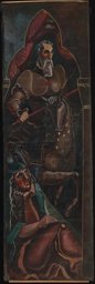 Le porte-lance à cheval et une des Marie assise (lancette de gauche de la Crucifixion)
