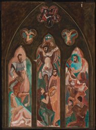 Suite à la violente polémique déclenchée par son vitrail des quatre Évangélistes posé en 1922 au portail occidental de la cathédrale, Marcel Poncet est autorisé à créer un second vitrail pour la cathédrale de Lausanne sur le thème de la Crucifixion, qu'il réalise sous étroite surveillance en s'adaptant aux exigences de la Commission. Les travaux préparatoires retracent la réflexion de Poncet pour ce travail commencé en 1924, et montrent l'écart existant entre ce que l'artiste a imaginé et le résultat final, suite sans doute à de nombreux compromis avec la Commission. Le vitrail est enfin achevé en 1927, et posé dans l'indifférence générale. Poncet est ensuite définitivement écarté de la cathédrale de Lausanne (NOVERRAZ, 2014, pp. 48-53 ; DONCHE GAY et HUGUENIN, 2003, pp. 15-16 ; DONCHE GAY, 1994, pp. 48-52 ; REYMOND, 1992, p. 55).