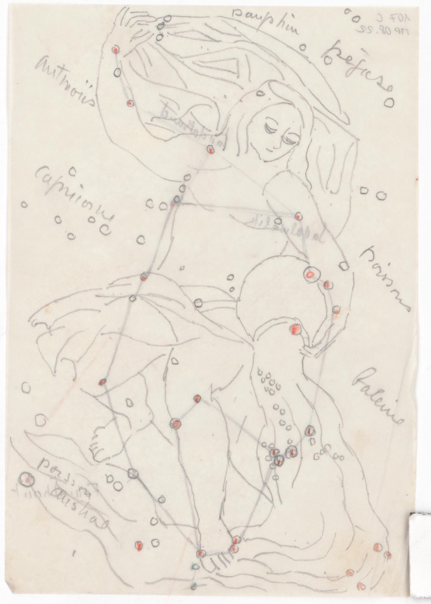 Étude pour des vitraux sur le thème de la "carte du ciel": le Verseau assis, versant de l'eau et déployant un ample drapé flottant derrière lui. La figure suit le tracé des étoiles et des lignes de sa constellation (dessinées au crayon au verso).