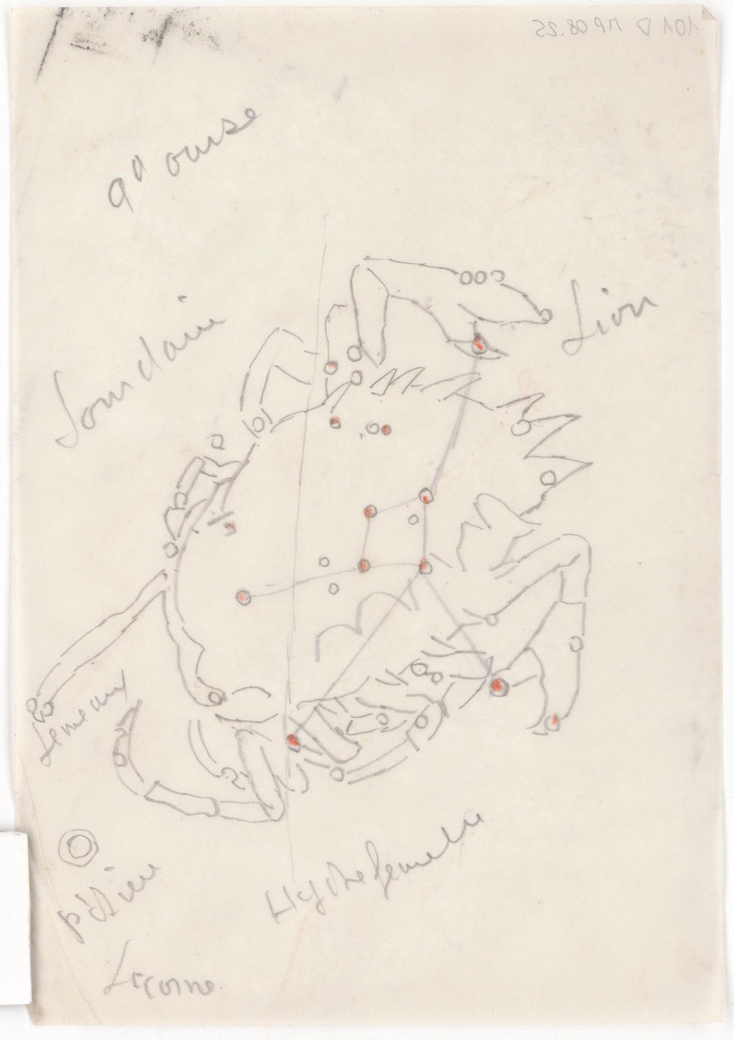 Étude pour des vitraux sur le thème de la "carte du ciel": le Cancer. La figure suit le tracé des étoiles et des lignes de sa constellation (dessinées au crayon au verso).