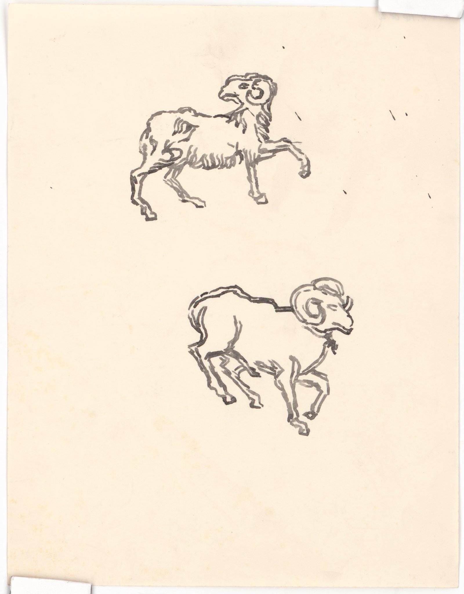 Esquisses pour des vitraux sur le thème de la "carte du ciel": le Bélier deux fois de profil, la tête tournée vers l'arrière et vers l'avant.