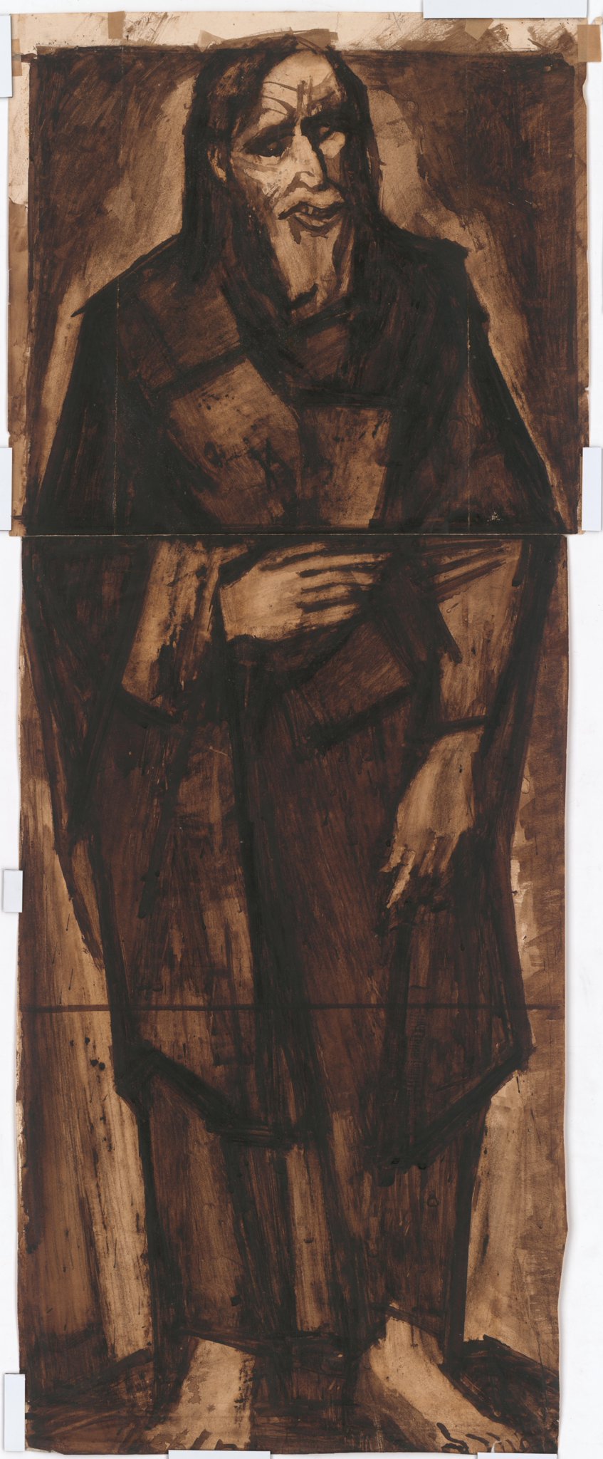 Ce travail préparatoire a été réalisé dans le cadre d'une commande de vitraux pour l'église Saint-Sigismond de Saint-Maurice en Valais. L'église ayant besoin d'être restaurée, le chanoine Louis Poncet propose à son frère de se charger de la réalisation de nouveaux vitraux, afin de remplacer les anciennes verrières du XIXème. La Paroisse disposant de peu de moyens, Marcel Poncet obtient un subside de la fondation Gleyre pour la réalisation de huit vitraux sur le thème des Prophètes. Les quatre premiers vitraux sont posés au cours de l'année 1944, et reçoivent des échos très positifs dans la presse. Les quatre derniers sont réalisés au cours de l'année 1946, et inaugurés en juin 1947. En 1960, les vitraux, alors jugés trop sombres pour la nef, ont été déplacés dans le choeur, superposés les uns au-dessus des autres. Ceux-ci n'ont retrouvé leur emplacement d'origine qu'en 2001, grâce à l'entremise de Jean-Pierre Coutaz, auteur des vitraux actuels du choeur. Ces oeuvres, qui jouent à la fois sur d'audacieux jeux de couleur et une grisaille abondante, semblent condenser les expériences antérieures de Marcel Poncet dans un nouvel équilibre entre ses métiers de peintre et de verrier. Les vitraux de Saint-Sigismond figurent, avec ceux de Saint-Paul de Grange-Canal et les quatre Evangélistes de la cathédrale de Lausanne, parmi ses réalisations les plus célèbres (NOVERRAZ, 2014, pp. 80-88 ; REYMOND, 1992, pp. 79, 108-112, 173-175 ; Dossier "Vitraux, Eglise Saint-Sigismond, Saint-Maurice, 1941-1947", boîte "VITRAUX II, 1932-1947", fonds Poncet, Vitrocentre Romont).