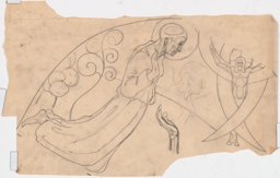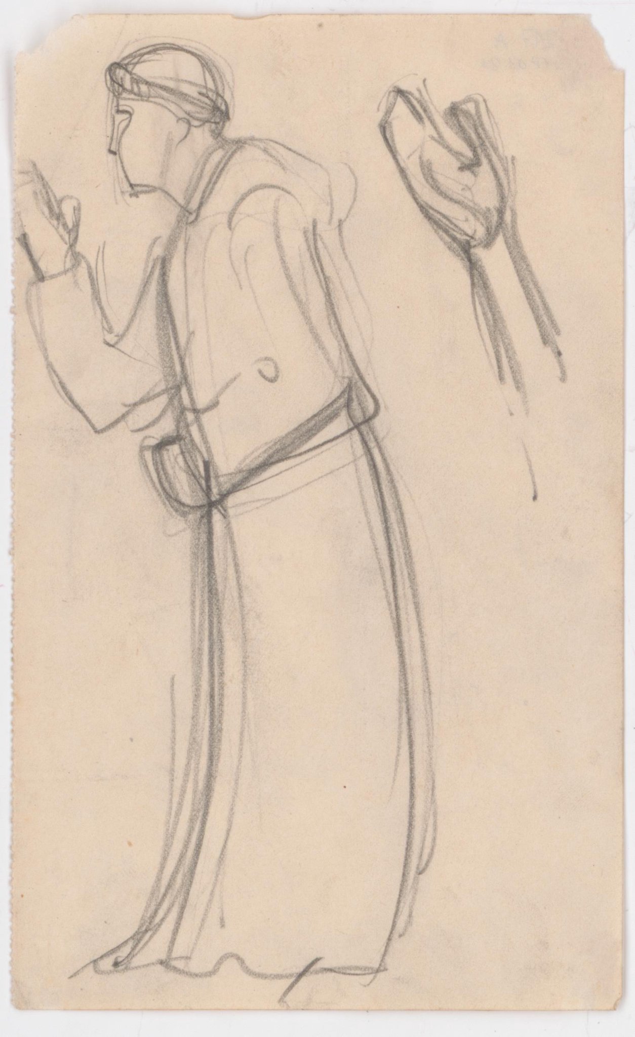 Plus de 70 projets peuvent être rattachés aux vitraux de Saint-Paul, et 51 aux trois vitraux des bas-côtés, mais l’ensemble n’est probablement pas complet. Pour le vitrail de saint François, il existe 12 oeuvres graphiques, dont sept peuvent être reliées à la scène médiane du vitrail (MP_01.20 ; MP_01.22 ; MP_01.21 ; MP_01.25 ; MP_01.26 ; MP_01.27 ; MP_01.75). Sur cette esquisse, l'artiste dessine le saint de profil, le dos légèrement baissé. On peut la relier à une première version de la scène de saint François prêchant aux oiseaux, dans laquelle le saint est représenté debout à droite devant un étang sur lequel flotte deux cygnes (MP_01.75). Peut-être à la demande du commanditaire, l'abbé Jacquet, l'artiste abandonnera cette version pour opter dans ses projets suivants (MP_01.25 ; MP_01.26 ; MP_01.27) pour une construction plus symétrique, où le saint occupe une place centrale, importante pour l'équilibre visuel de l'ensemble du vitrail. Une autre esquisse similaire le montre dans une posture complètement identique à celle du projet avec les cygnes (MP_01.22).