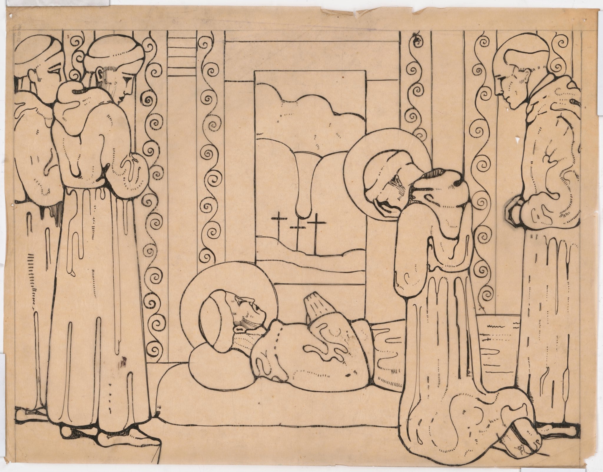 Plus de 70 projets peuvent être rattachés aux vitraux de Saint-Paul, et 51 aux trois vitraux des bas-côtés, mais l’ensemble n’est probablement pas complet. Pour le vitrail de saint François, il existe 12 oeuvres graphiques, dont deux seulement peuvent être reliées à la scène inférieure du vitrail (MP_01.28 et MP_01.29). Ce projet montre un état presque définitif de la scène. Tous les éléments de la composition sont fixés et se retrouveront de manière presque identique sur le vitrail, en dehors des frises décoratives qui ornent les murs, remplacées sur le vitrail par de simples poutres brunes travaillées à la grisaille pour créer un effet de texture évoquant le bois. Ces fioritures ont peut-être été jugées inadaptées pour une scène dépeignant la mort de François d’Assise, fondateur d’un ordre prônant la pauvreté et le dénuement.