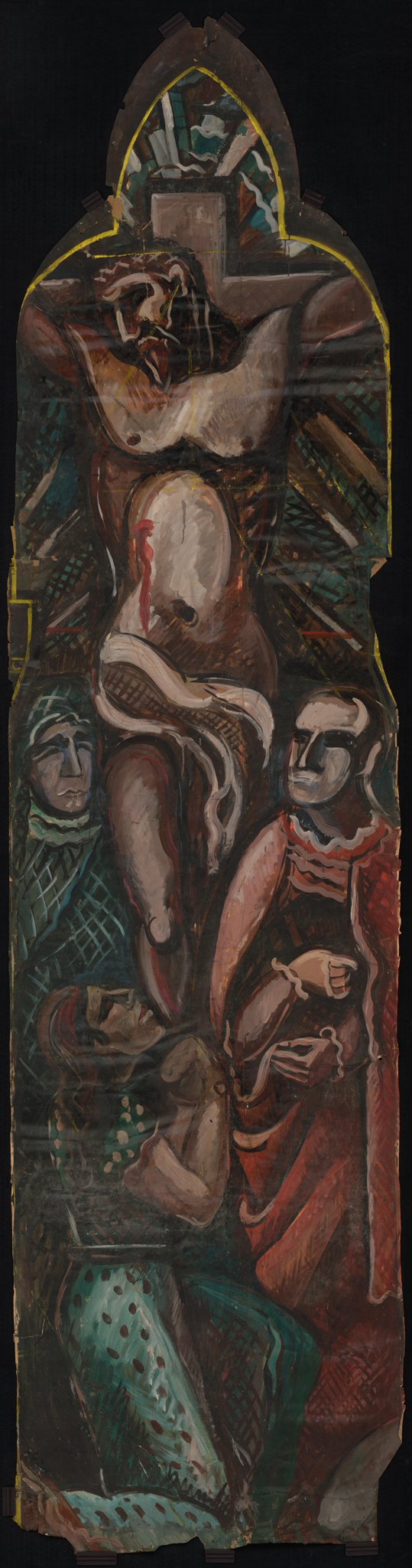 Ce carton en couleur a été réalisé pour la lancette centrale du vitrail de la Crucifixion. Bien que la composition soit similaire, il présente de grandes différences avec le vitrail, par ses tonalités sombres servies par une pâte abondante, dans la lignée de certaines oeuvres de Georges Rouault. Tout comme cet artiste, Poncet présente un Christ en souffrance, très humain, à l'allure moins triomphante que celui qu'il réalise finalement sur le vitrail. La technique de l'huile, éminemment picturale, est utilisée à plusieurs reprises dans le cadre de cette commande. Le vitrail de la Crucifixion correspond à une période où Poncet effectue de nombreux séjours à Paris, lui donnant l'occasion d'évoluer dans sa pratique de peintre de chevalet et de se confronter à la peinture d'autres artistes, comme Rouault (Noverraz, 2014, p. 42).