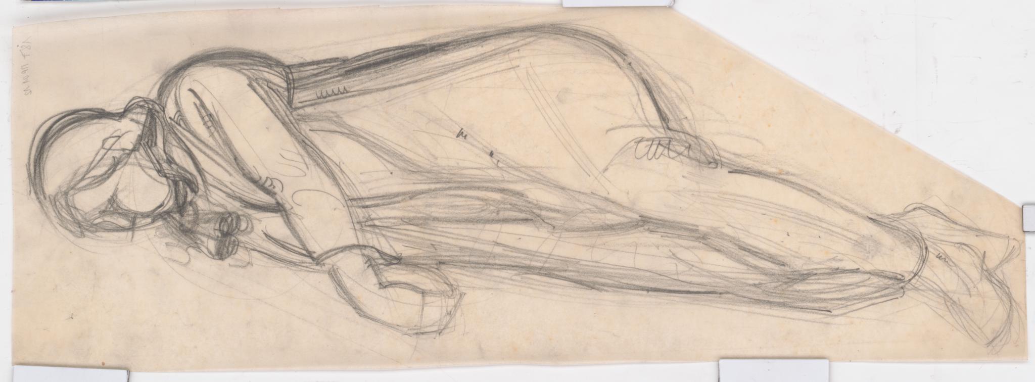 Plus de 70 projets peuvent être rattachés aux vitraux de Saint-Paul, et 51 aux trois vitraux des bas-côtés, mais l’ensemble n’est probablement pas complet. Pour le vitrail de sainte Cécile, il existe 17 oeuvres graphiques dont six peuvent être reliées à la scène inférieure du vitrail (MP_01.11 ; MP_01.12 ; MP_01.13 ; MP_01.14 ; MP_01.15 ; MP_01.16). Elles illustrent particulièrement bien les différentes étapes qui jalonnent le processus de création. L'artiste commence par travailler sa composition sous forme d'esquisse, afin d'établir les grandes lignes de sa composition (MP_01.11) et l’allure et le positionnement de ses personnages (MP_01.13), comme ici sainte Cécile, sur laquelle il se concentre spécifiquement et dont il définit la position sur le sol. Cette esquisse précède les trois dessins d'ensemble consacrés à cette scène (MP_01.11, MP_01.14, MP_01.15, MP_01.16), puisque l'on constate qu'il a modifié la position de son bras gauche ainsi que celle de ses jambes et de ses pieds. Une fois ces éléments principaux fixés, il s’intéresse à l’équilibre des contrastes et aux jeux d'ombre et de lumière sur un dessin travaillé au crayon de manière très minutieuse (MP_01.14), présentant des hachures qui évoquent le futur travail de la grisaille, dans une démarche qui est autant celle du peintre que du verrier. Il détermine enfin l'emplacement du futur réseau de plomb sur deux autres travaux (MP_01.15 et MP_01.16).