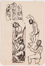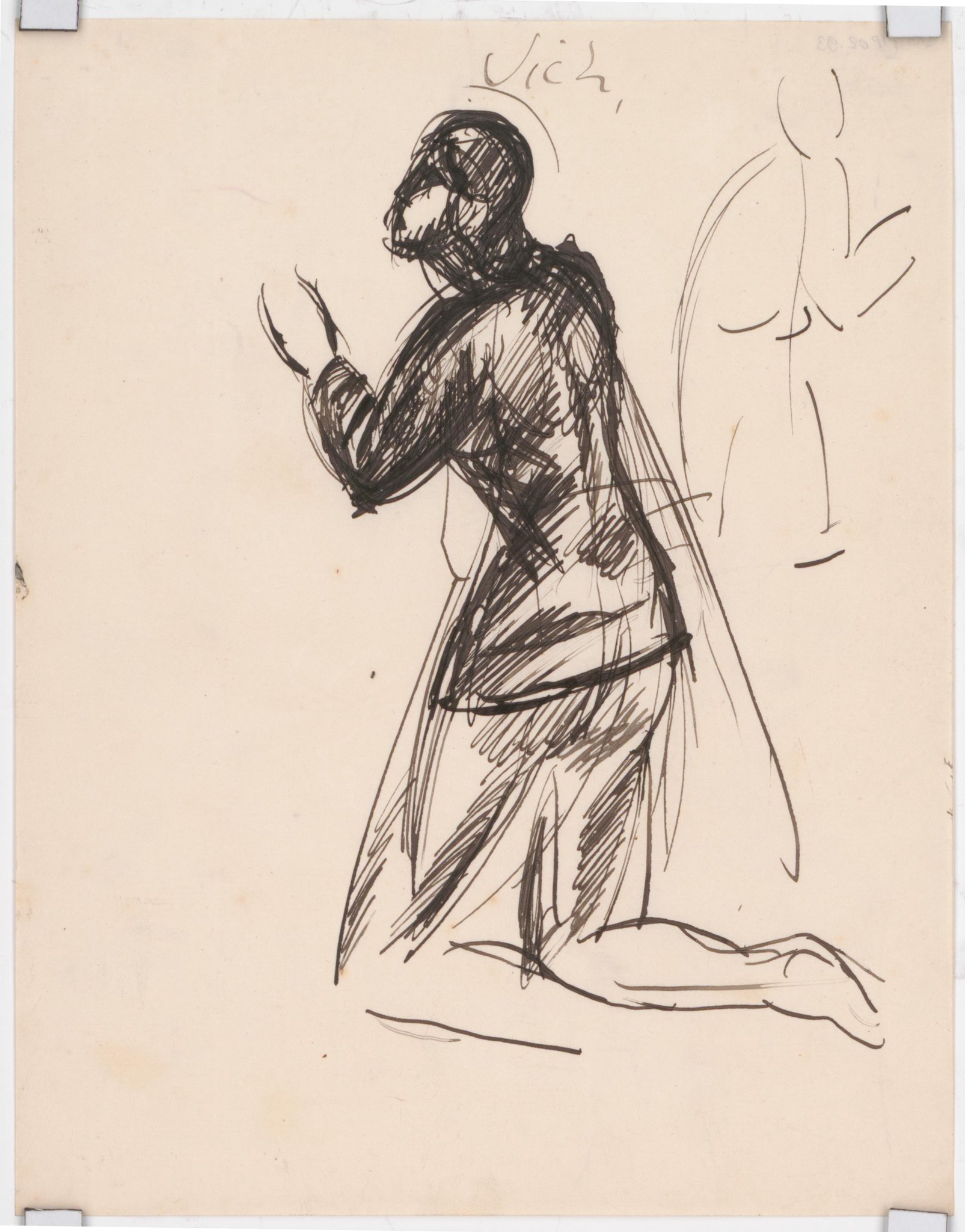 Personnage féminin agenouillé de profil, la tête et une main levée, probablement Marie Madeleine au pied de la Croix. A droite petite esquisse du même personnage (?) dans l'autre sens.