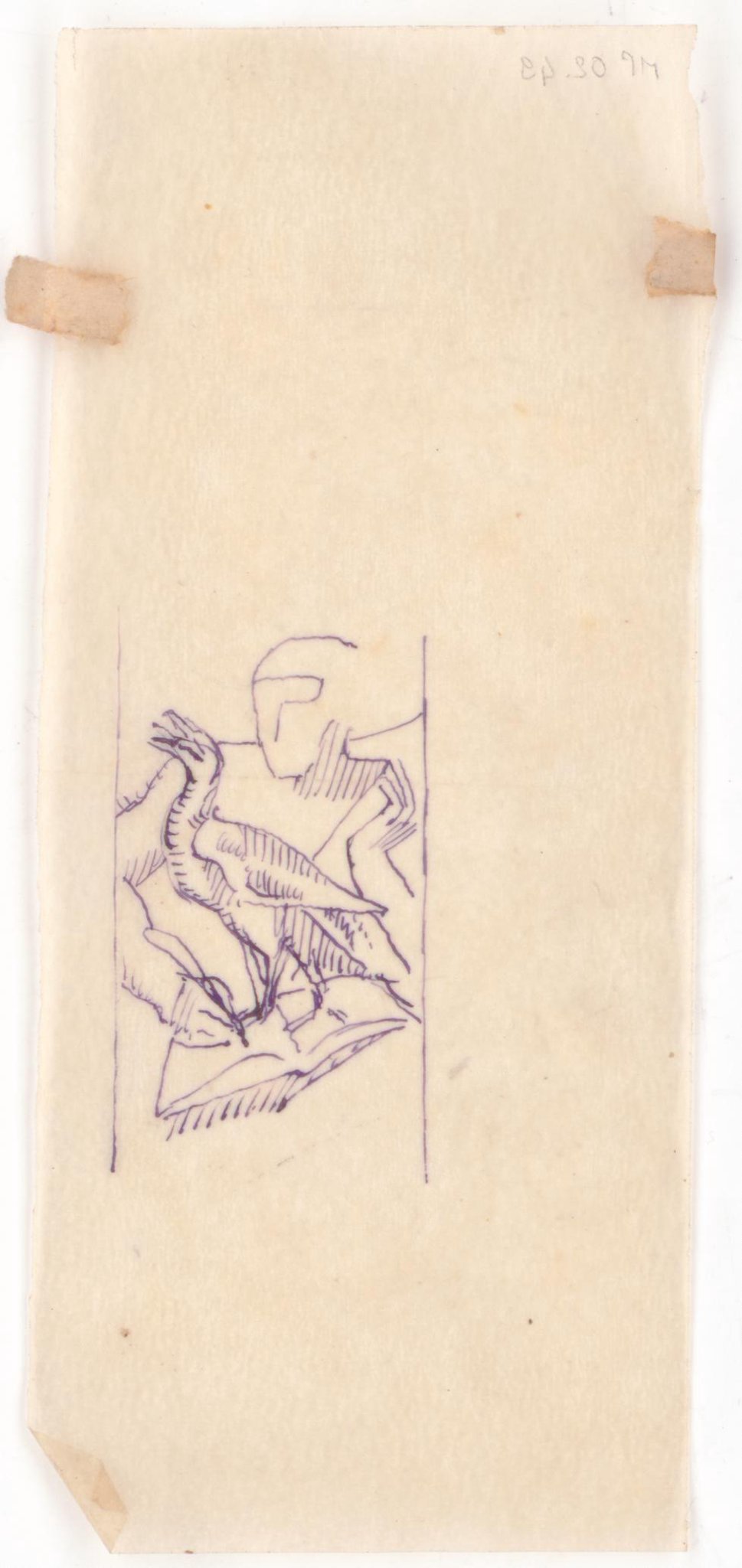 Haut du corps de saint Jean couché, la tête tournée de trois-quarts, prenant appui sur son bras gauche dont la main est levée, écrivant son Evangile posé à terre, sur lequel l'aigle est posé.