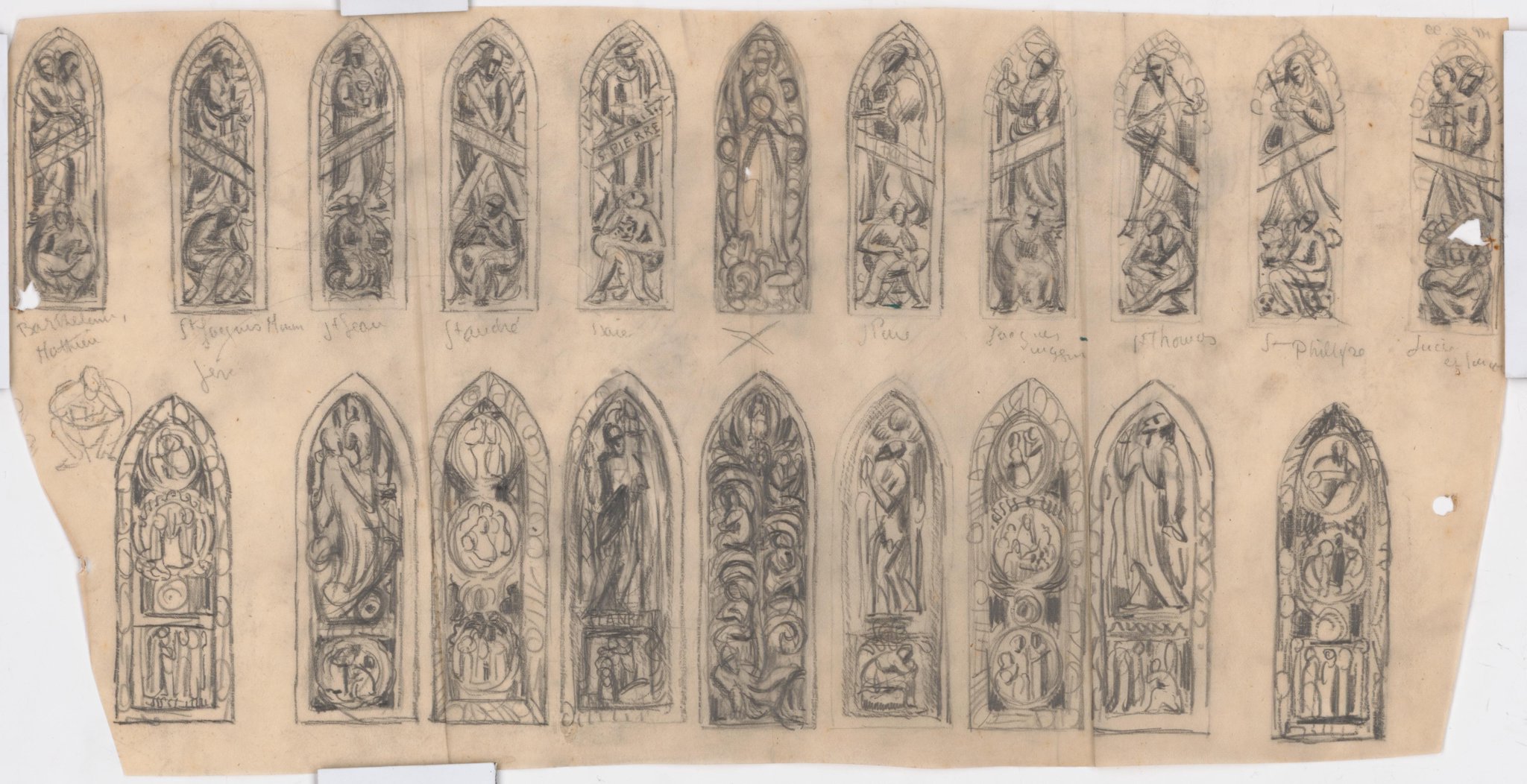 Le Comité de restauration de la cathédrale de Lausanne désirant orner cet édifice de nouveaux vitraux, un concours est organisé entre 1918 et 1919 afin de choisir l'artiste chargé de succéder à Eugène Grasset décédé deux ans plus tôt. Marcel Poncet, âgé de seulement vingt-quatre ans et désavantagé par sa confession catholique, parvient cependant à l'emporter face à des artistes confirmés tels qu'Ernest Biéler ou Louis Rivier, grâce à son projet sur le thème : "Aymon de Montfalcon fonde la chapelle de saint Maurice et des martyrs thébains". Pour ce concours, les artistes devaient également réaliser une maquette pour un vitrail destiné aux fenêtres hautes du choeur (non réalisé) inspiré d'une esquisse d'Eugène Grasset représentant saint Pierre et Esaïe (la maquette est conservée aux Archives de la cathédrale de Lausanne). Poncet ne se contente pas de travailler à ces deux thèmes, mais élabore un programme complet comprenant l'ensemble des verrières de la cathédrale, dont il s'agit ici d'un croquis (l'esquisse du vitrail de saint Pierre et Esaïe correspond à la cinquième fenêtre représentée sur ce croquis). Dans le rapport commenté que les artistes doivent remettre avec leur projet au Comité, Poncet marque son souhait de faire communier étroitement l'Ancien et le Nouveau Testament. Cependant, suite au scandale déclenché par son premier vitrail des quatre Evangélistes pour cet édifice en 1922, Poncet ne pourra réaliser qu'une seule autre verrière sur le thème de la Crucifixion pour la chapelle Saint-Michel, posée en 1927. Il est ensuite écarté définitivement de la cathédrale, sans pouvoir concrétiser ce vaste programme (DONCHE GAY, 1994, pp. 27-31).
