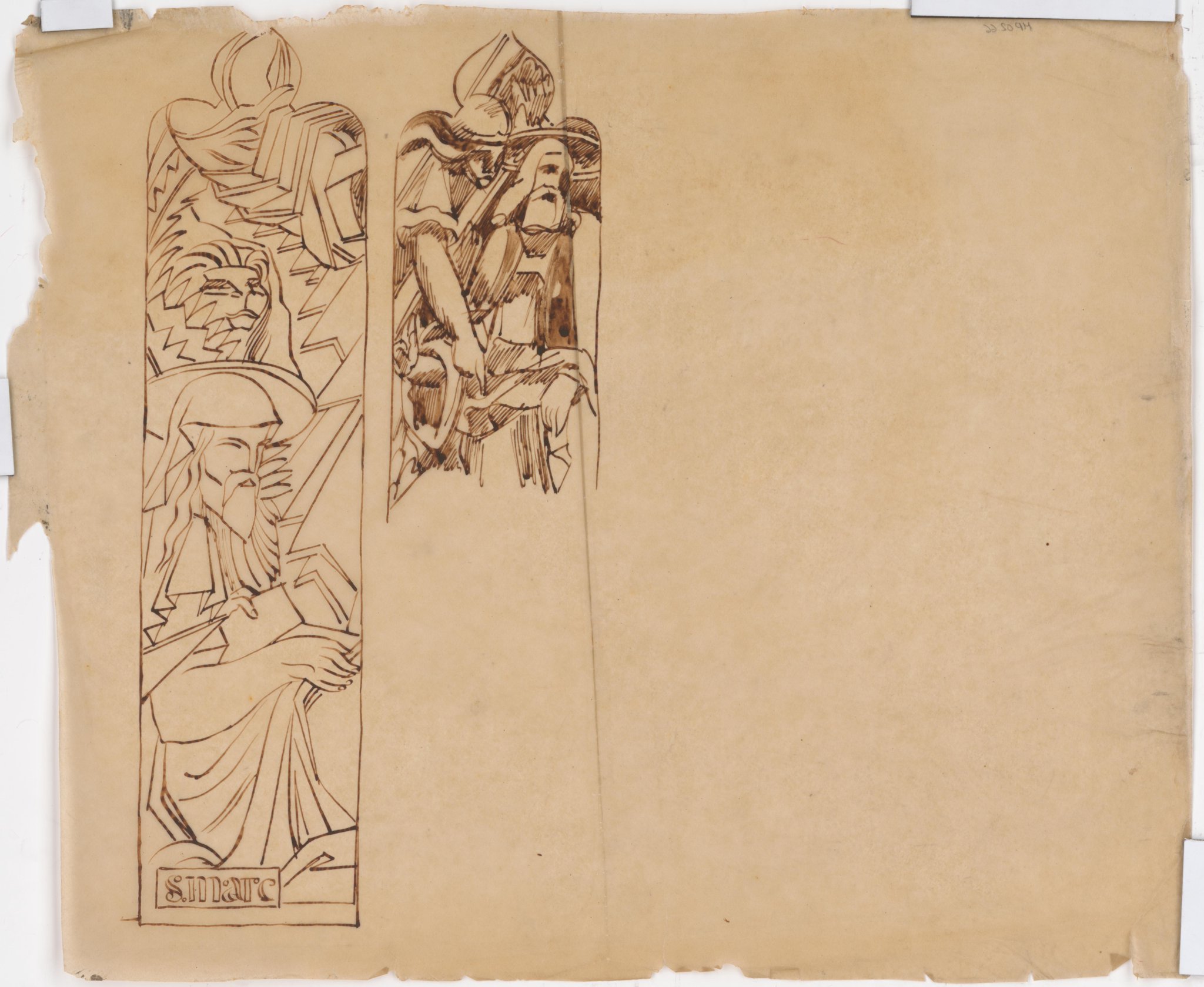 Les deux lancettes de gauche du vitrail des quatre Evangélistes, avec saint Marc assis de profil en bas à gauche, le lion au-dessus de lui, et à droite, saint Mathieu assis et l'ange, volant à sa gauche et pointant du doigt son Evangile.