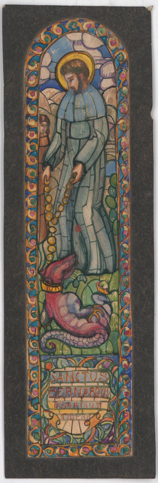 Ce travail préparatoire a été réalisé par Marcel Poncet dans le cadre d'une commande de vitraux obtenue en 1917 pour la chapelle de la Prévôté du Grand-Saint-Bernard à Martigny, en Valais.