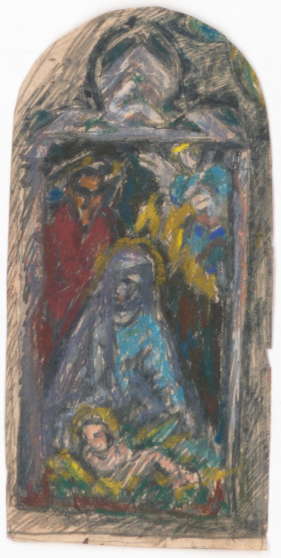 Il s'agit d'une esquisse en couleur pour la partie de gauche de ce vitrail à deux lancettes.