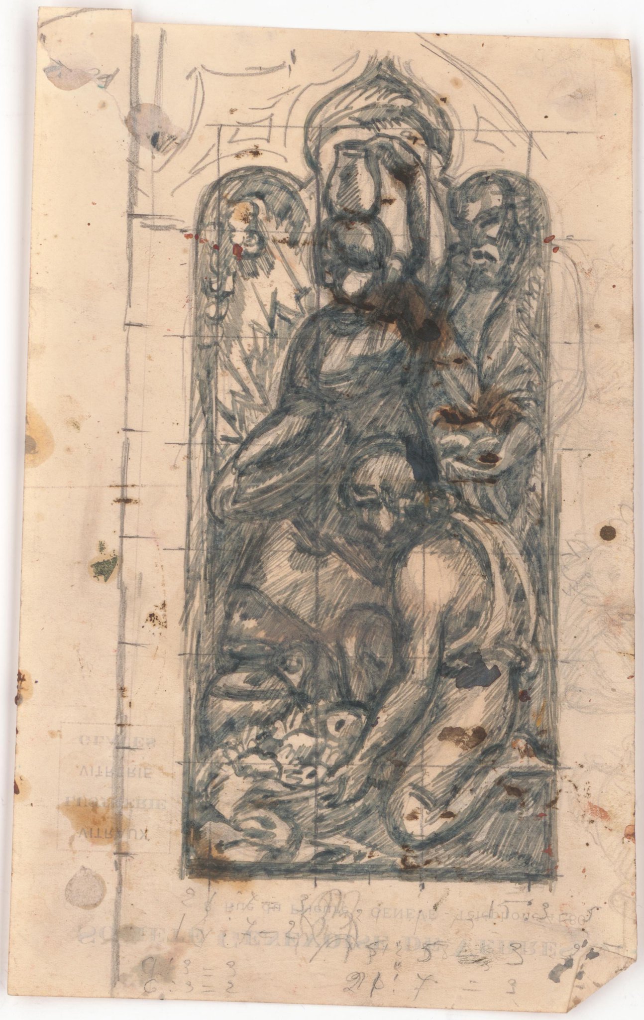 Il s'agit d'une esquisse pour la partie de droite de ce vitrail à deux lancettes, représentant des personnages apportant des présents au Christ. Il ne s'agit cependant pas d'une adoration des Mages, car un des personnages représenté est une femme. Il semble que l'artiste ait plutôt voulu représenter des gens du peuple.