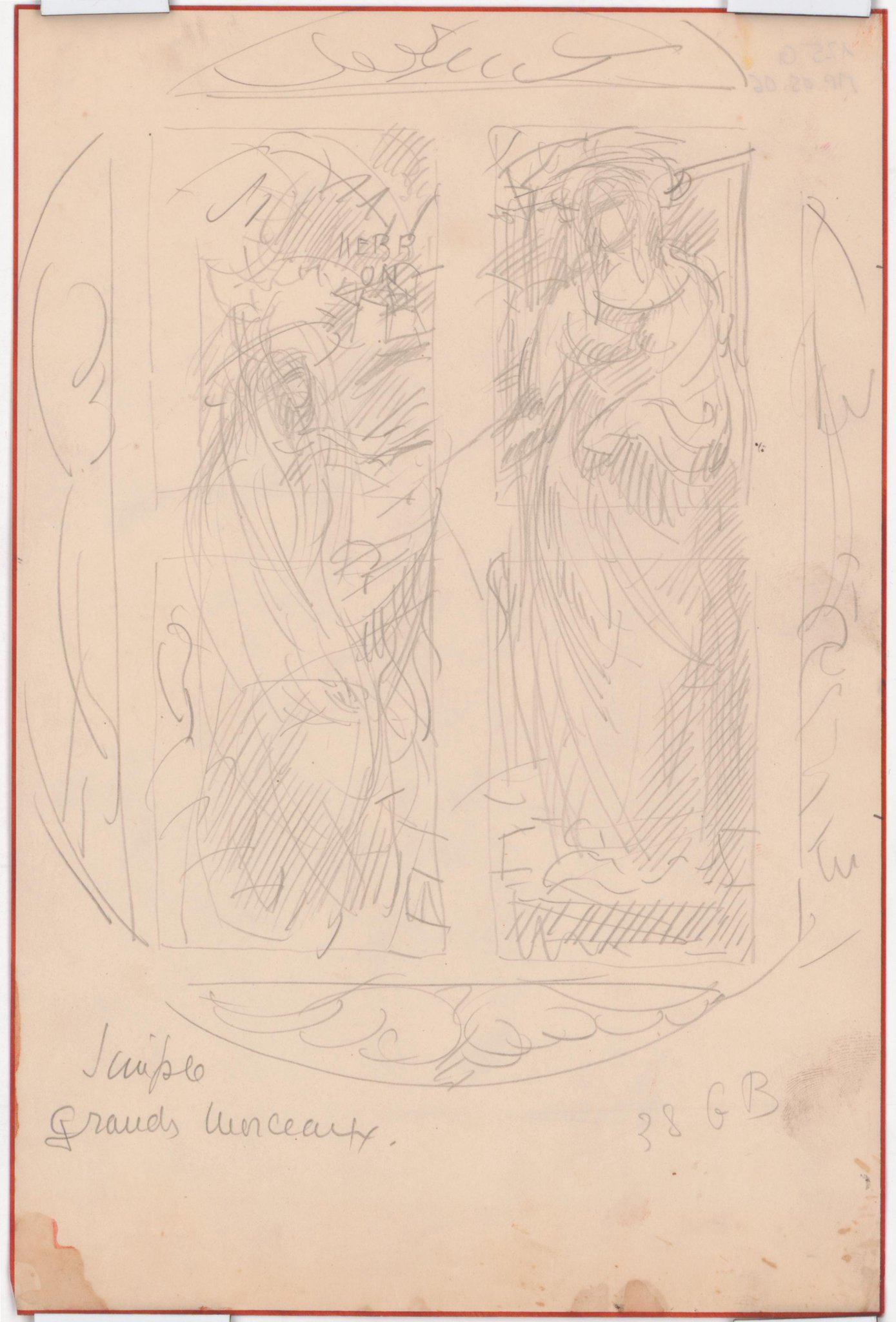 Esquisse pour le vitrail de la Visitation : de forme ronde, dont le centre est découpé en quatre parties, comprenant Élisabeth à gauche de dos, accueillant Marie debout sur la droite.