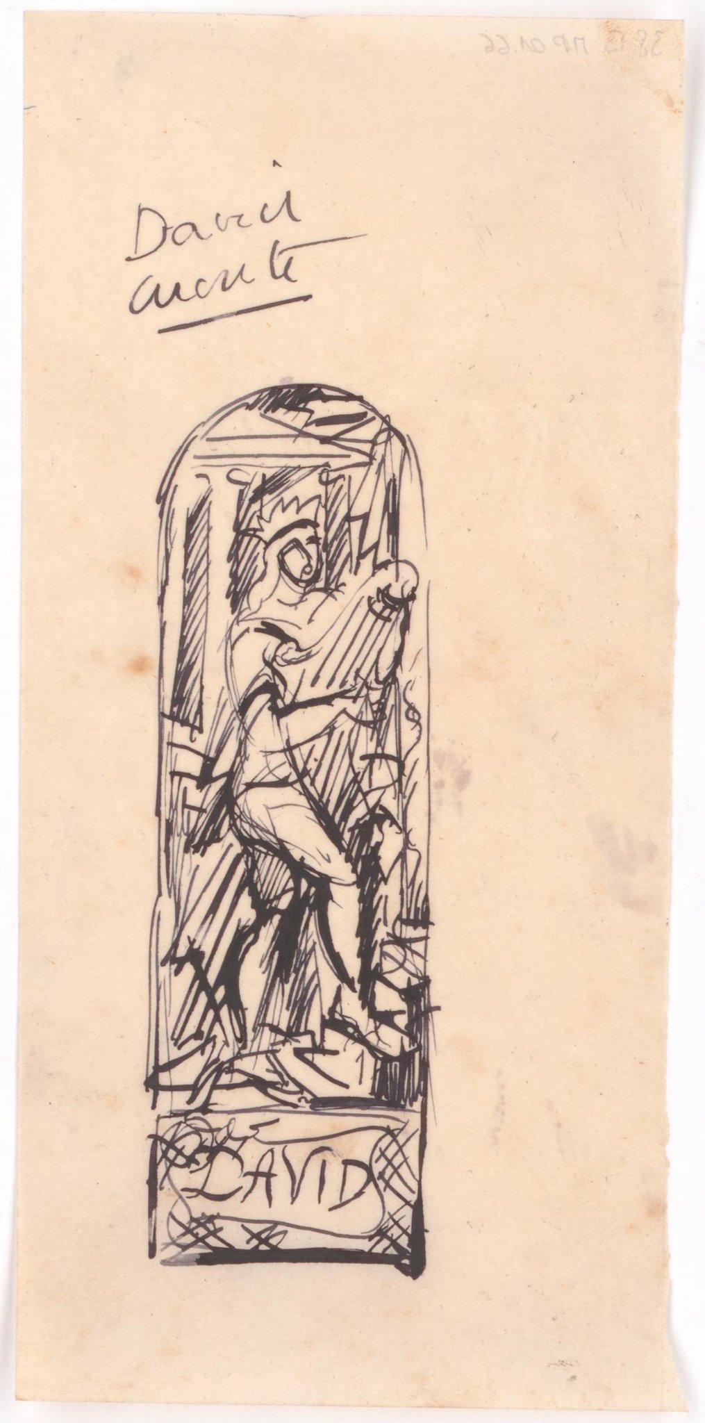 Esquisse pour un vitrail en plein cintre avec David en pied, couronné et tenant la harpe. La partie basse comporte un cartouche contenant son nom.