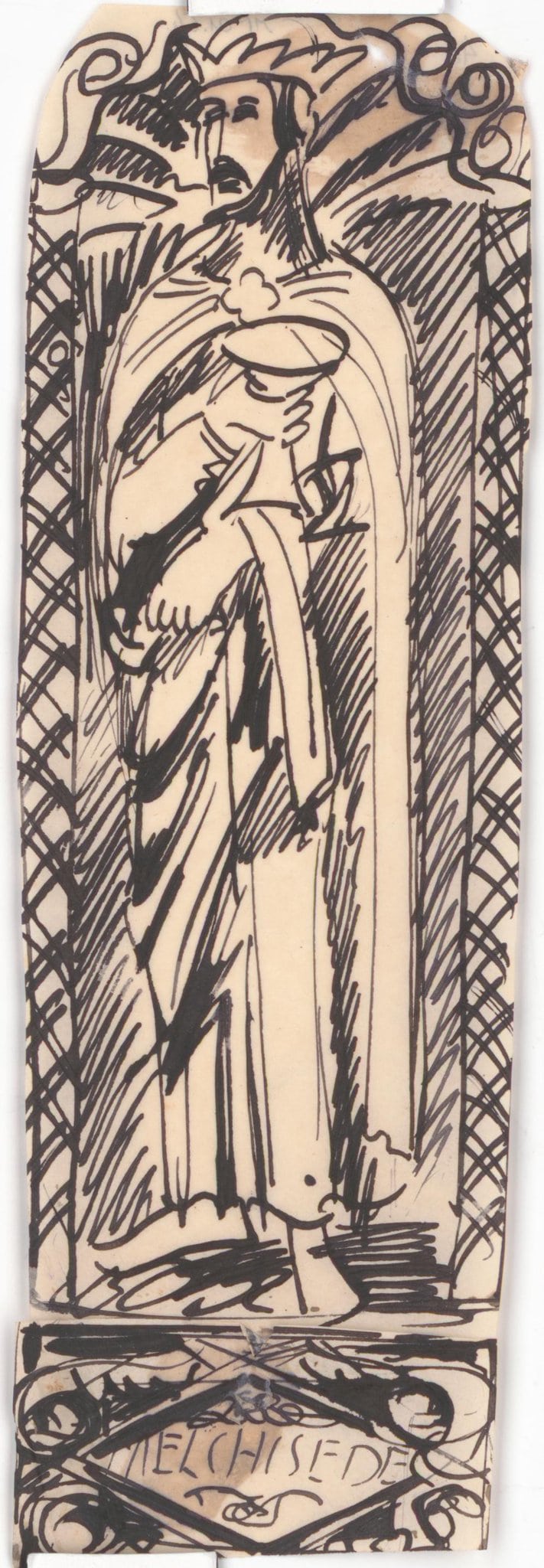 Esquisse d'un vitrail en plein cintre représentant Melchisedech en pied, couronné et tenant un calice. Il est inséré dans un encadrement architectural formé de deux colonnes torses supportant un arc polylobé et se tient sur un socle avec un cartouche contenant son nom.