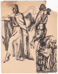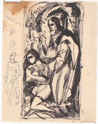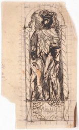 L'analyse du fonds graphique indique que l'artiste commence par réfléchir aux caractéristiques physiques et psychologiques de ses personnages à travers des esquisses accompagnées de notes (MP_01.62 ; MP_01.50). Plusieurs solutions ont été envisagées pour le vitrail d'Abraham (par exemple MP_01.55 ; MP_01.57 ; MP_01.73), dont celle-ci qui montre une représentation plus hiératique du prophète accompagné de son fils, au sein d'un encadrement architectural similaire aux autres vitraux. Sur cette esquisse, Poncet a déjà établi de manière presque définitive la position des personnages et leurs attributs, ainsi que le dais qui les entoure. Il modifiera la position de la main de Melchisedech, relâchée ici, pour lui faire soutenir le calice. Ce détail n'est pas encore modifié sur la maquette en camaïeu (MP_01.68), tandis que le carton montre une version aboutie de Melchisedech (MP_01.73), sans son encadrement architectural.