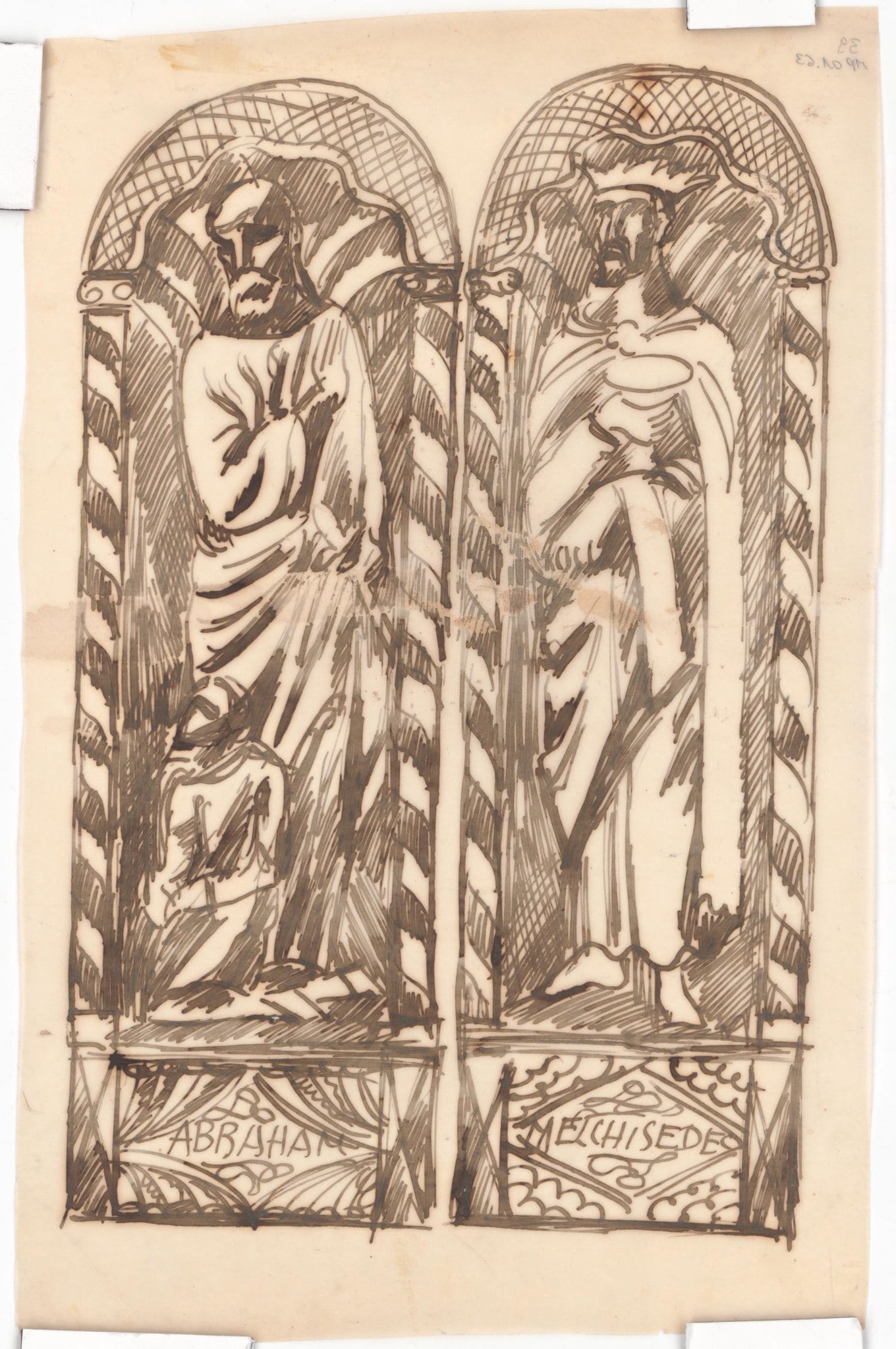 Esquisse de deux vitraux en plein cintre avec grands personnages. A gauche, Abraham en pied, un couteau à la main, s'apprête à sacrifier Isaac agenouillé. A droite, Melchisedech en pied, couronné, tient un calice. Chaque personnage est inséré dans un encadrement architectural formé de deux colonnes torses supportant un arc polylobé et se tient sur un socle avec un cartouche contenant son nom.
