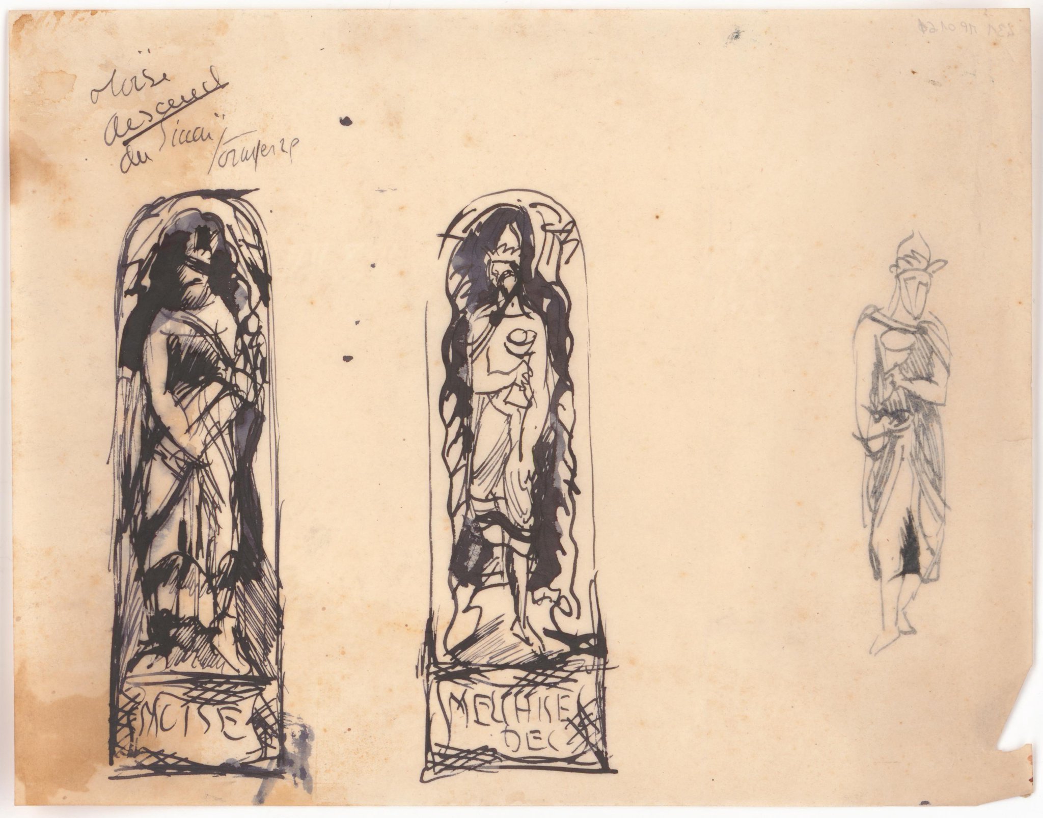 Plus de 70 œuvres graphiques peuvent être rattachées aux vitraux de Saint-Paul, et 21 aux vitraux de la tribune. L'artiste commence par réfléchir aux caractéristiques physiques et psychologiques de ses personnages à travers des esquisse accompagnée de notes (MP_01.62 ; MP_01.65 ; MP_01.53). Il travaille ensuite ses personnages dans le contexte du vitrail. Sur ce travail préparatoire, qui montre Moïse et Melchisedech, Poncet s'intéresse à la composition générale et à la proportion des personnages par rapport à l'encadrement architectural. Il va ensuite établir la disposition quasiment définitive des figures (MP_01.59 ; MP_01.60 ; MP_01.64), que l'on retrouve sur une maquette en camaïeu (MP_01.68) qui présente quelques différences avec l'oeuvre finale, notamment en ce qui concerne la figure de Moïse qui ne tient plus de bâton cruciforme et lève la doigt de la main gauche vers le ciel sur le vitrail (GE_08.22). L'artiste réalise encore un carton, également en camaïeu, pour la figure de Melchisedech (MP_01.73), sans son encadrement architectural. Il n'existe pas de carton correspondant au vitrail de Moïse dans le fonds.
