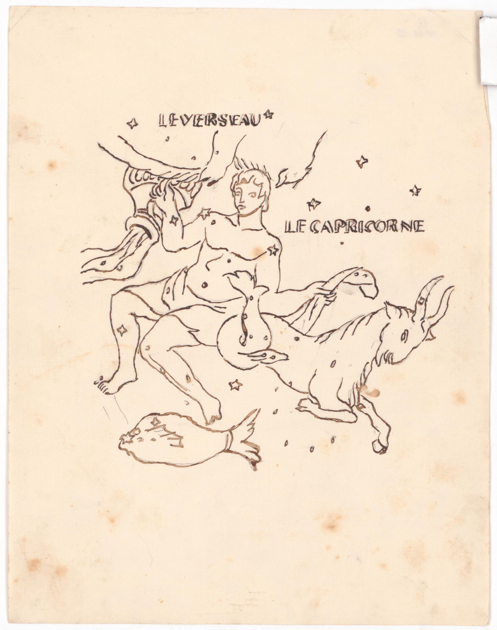 Étude pour des vitraux sur le thème de la "carte du ciel": les signes du Verseau et du Capricorne représentés flottants au milieu d'un ciel étoilé. Le Verseau assis tient la cruche de la main droite et un pan de son manteau de la main gauche. Le Capricorne à queue de poisson est incliné vers la droite. En dessous d'eux, le Poisson.