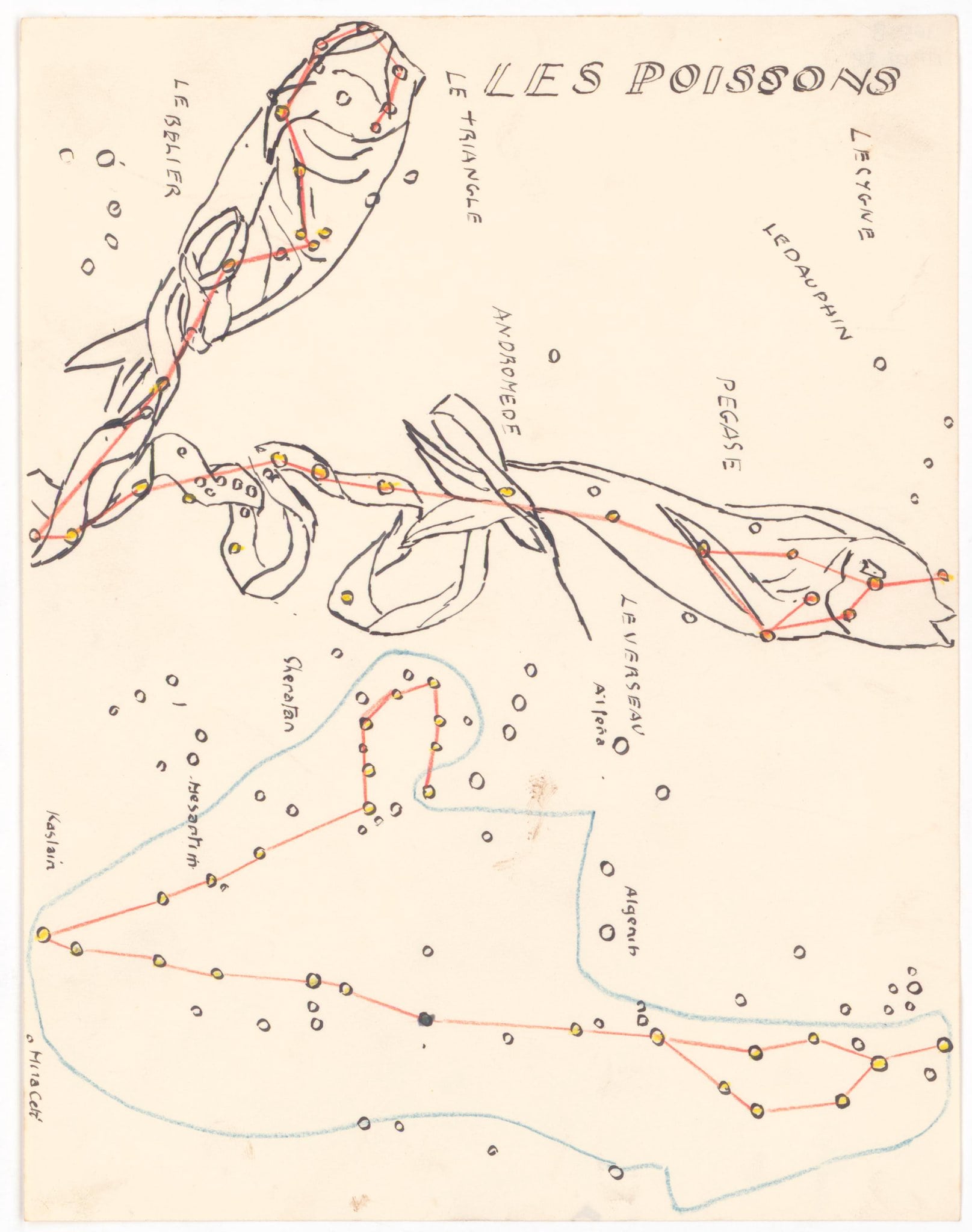 Étude pour des vitraux sur le thème de la "carte du ciel": les Poissons à gauche, liés par un ruban et dirigés dans des directions différentes. Les figures suivent le tracé de leur constellation, dessinée en rouge, les étoiles en jaune. A droite, la constellation délimitée en bleu, entourée des autres étoiles.