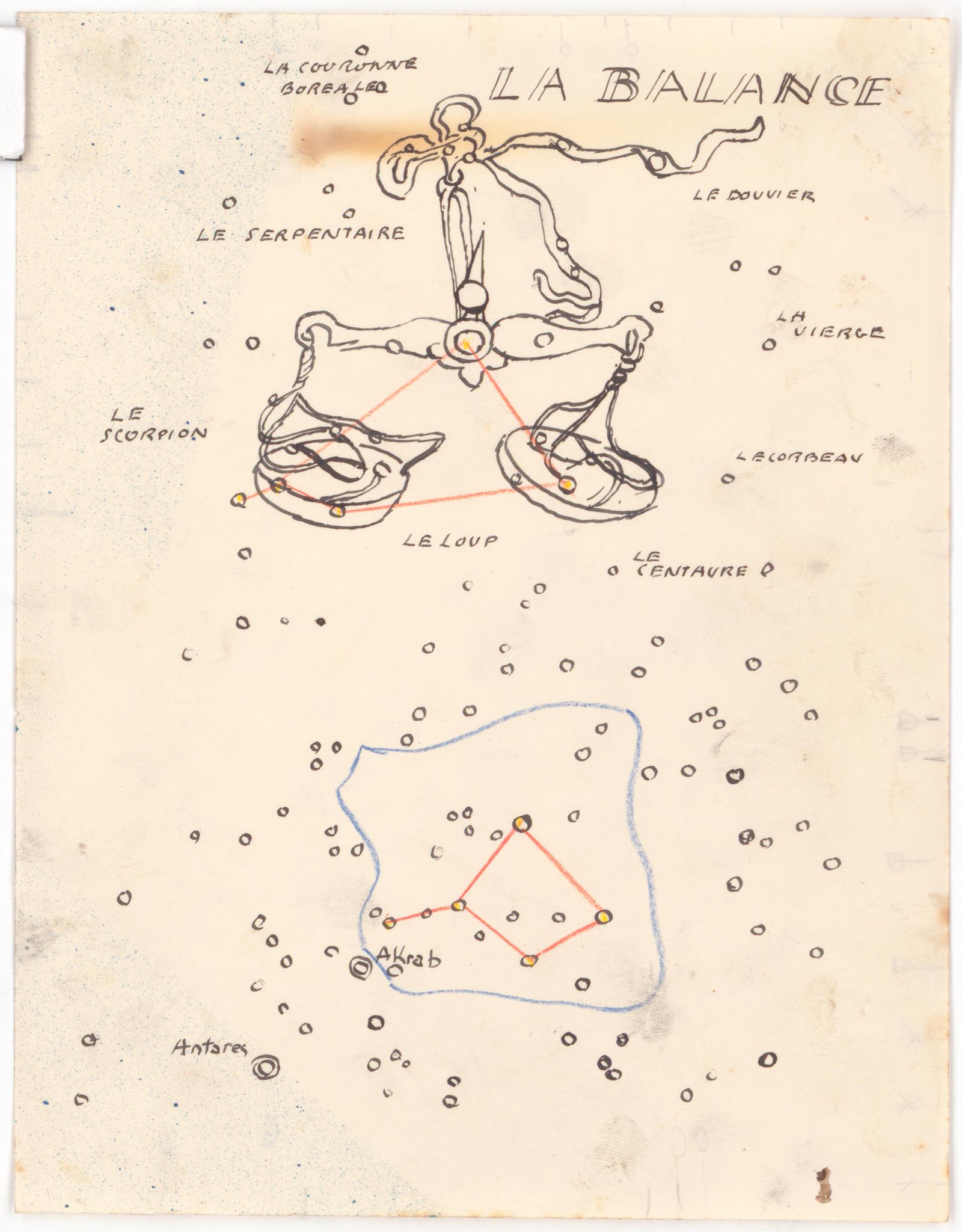 Étude pour des vitraux sur le thème de la "carte du ciel": la Balance en haut, suivant le tracé de sa constellation, dessinée en rouge, les étoiles en jaune. En bas, la constellation délimitée en bleu, entourée des autres étoiles.