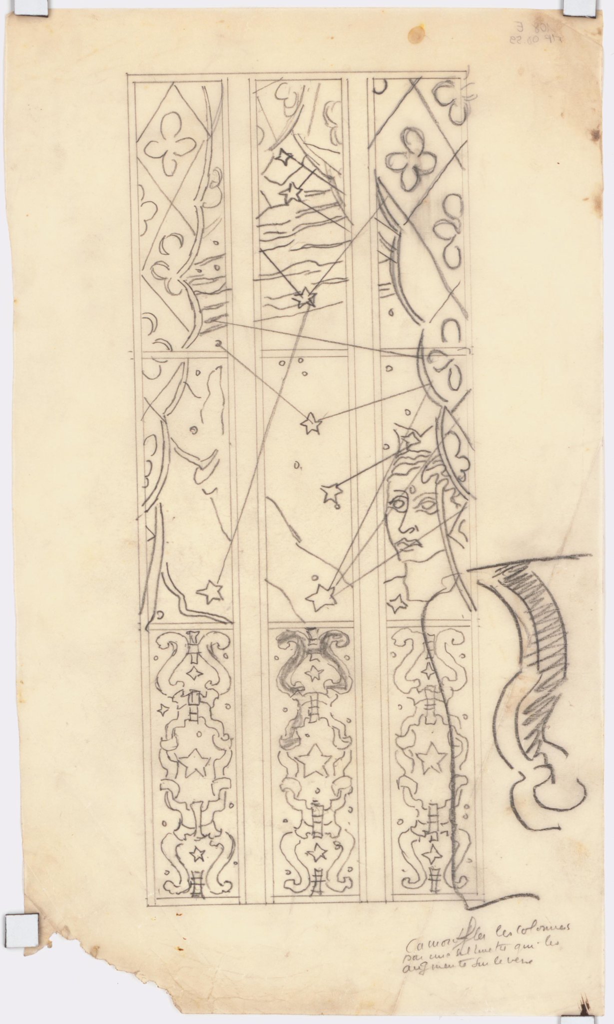 Projet de vitraux sur le thème de la "carte du ciel" : la constellation de la Lyre, représentée par un personnage couronné, le bras levé, sur fond de ciel étoilé. Le registre du bas est composé de motifs décoratifs en forme de lyres. A droite au crayon : petite esquisse de la forme d'une lyre.