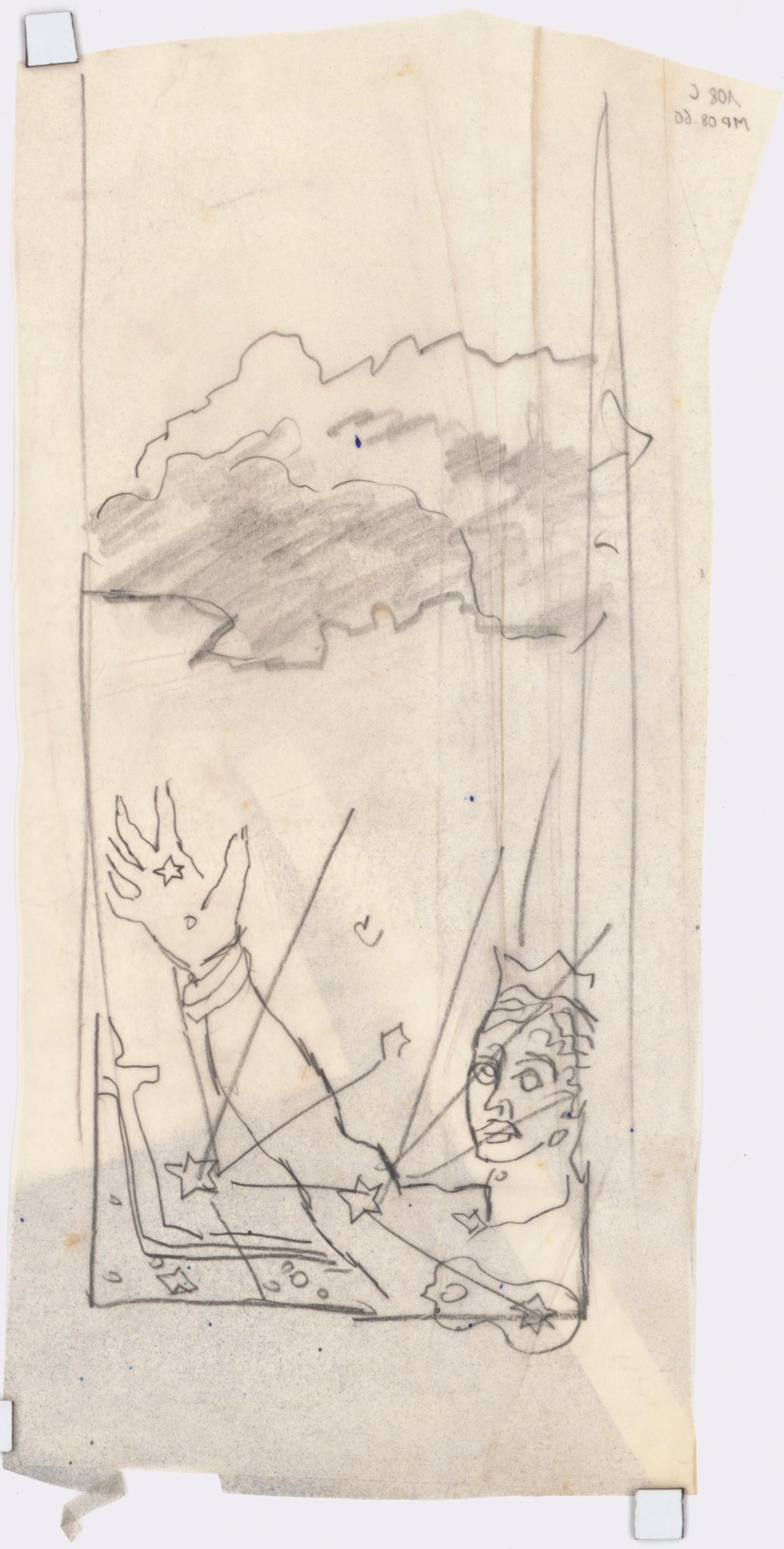 Esquisse pour des vitraux sur le thème de la "carte du ciel" : personnage couronné pour le vitrail de la constellation de la Lyre, le bras levé, sur un fond de ciel étoilé avec un nuage au dessus de lui.