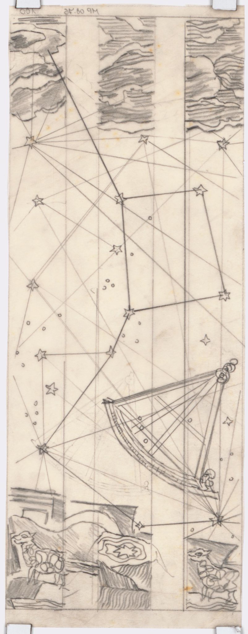 Ce travail préparatoire peut probablement être rattaché à une commande de l'architecte W. Henauer à Marcel Poncet pour les vitraux de sa nouvelle église de Wollishofen en 1937 (Reymond, 1992, p. 170), qui ne seront pas réalisés pour des raisons inconnues. Deux projets représentant 17 fenêtres sur le thème des cartes du ciel avec des inscriptions en allemand et la date de 1937 (MP 08.58 et MP 08.176), ont pu être attribués à cette commande. C'est sur la base de ces travaux très détaillés que le corpus des oeuvres préparatoires pouvant y être rattachées a pu être établi.