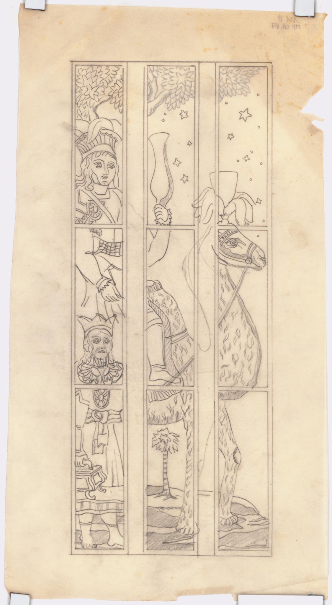 Projet pour des vitraux sur le thème de la "carte du ciel": Deux rois mages couronnés et richement vêtus, l'un montant un chameau et levant un vase dans sa main gauche, l'autre debout au premier plan portant un petit coffret. L'arrière-plan est composé d'une colline avec un palmier et d'un arbre surplombant les rois mages.