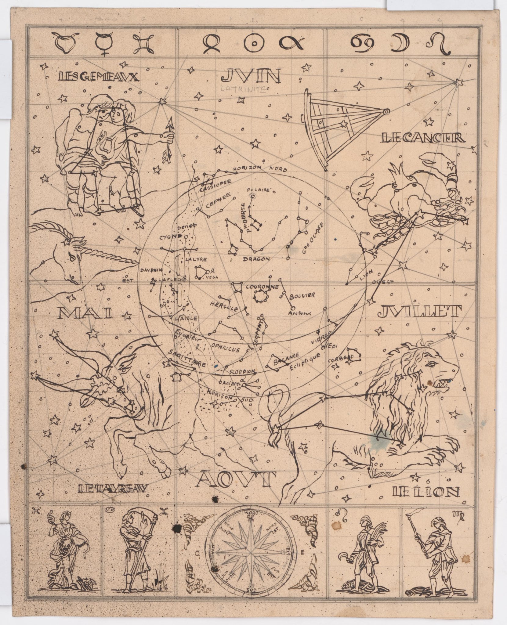 [De gauche à droite et de haut en bas en petit :] HORIZON NORD / CASSIOPEE / CEPHEE // POLAIRE / DENEB / CYGNE // Pte OURSE // Gde OURSE / LA LYRE // DRAGON / DAUPHIN / LA FLECHE // VEGA / COURONNE / HERCULE // BOUVIER / ARCTURUS / L'AIGLE / EQUATEUR // OPHIUCUS // SERPENT // VIERGE / SAGITTAIRE // SCORPION // BALANCE // L'EPI / ANTARES // ECLIPTIQUE // CORBEAU / HORIZON SUD.