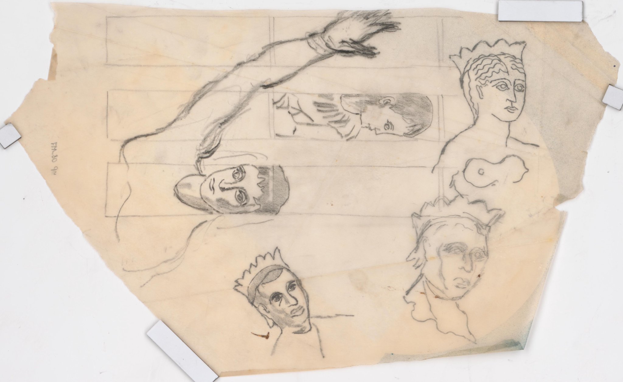Esquisses pour des vitraux sur le thème de la "carte du ciel" : la personnification de la Lyre pour le vitrail de la constellation de la Lyre, avec d'autres personnages couronnés, dont un féminin.