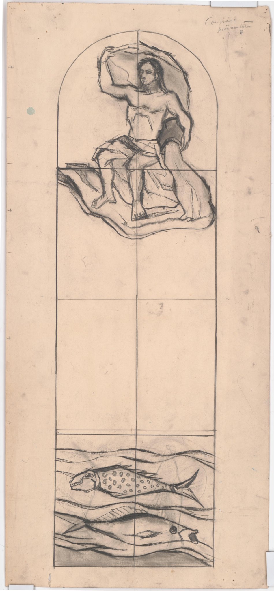 Projet pour des vitraux sur le thème de la "carte du ciel" avec deux signes du zodiaque à chaque extrémité. Les Poissons, l'un au-dessus de l'autre flottant dans l'eau en bas, et le Verseau assis en haut, tenant sa cruche sous le bras et levant l'autre au-dessus de sa tête.