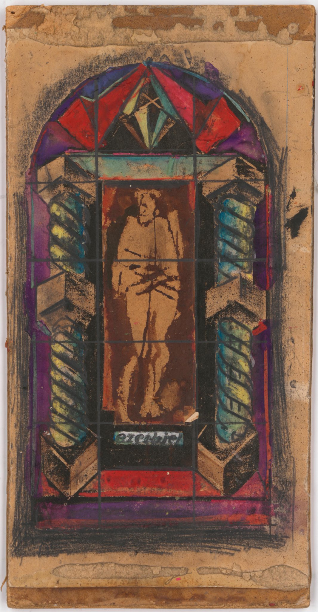 Ce travail préparatoire a été réalisé dans le cadre d'une commande de vitraux pour l'église Saint-Sigismond de Saint-Maurice en Valais. L'église ayant besoin d'être restaurée, le chanoine Louis Poncet propose à son frère de se charger de la réalisation de nouveaux vitraux, afin de remplacer les anciennes verrières du XIXème. La Paroisse disposant de peu de moyens, Marcel Poncet obtient un subside de la fondation Gleyre pour la réalisation de huit vitraux sur le thème des Prophètes. Les quatre premiers vitraux sont posés au cours de l'année 1944, et reçoivent des échos très positifs dans la presse. Les quatre derniers sont réalisés au cours de l'année 1946, et inaugurés en juin 1947. En 1960, les vitraux, alors jugés trop sombres pour la nef, ont été déplacés dans le choeur, superposés les uns au-dessus des autres. Ceux-ci n'ont retrouvé leur emplacement d'origine qu'en 2001, grâce à l'entremise de Jean-Pierre Coutaz, auteur des vitraux actuels du choeur. Ces oeuvres, qui jouent à la fois sur d'audacieux jeux de couleur et une grisaille abondante, semblent condenser les expériences antérieures de Marcel Poncet dans un nouvel équilibre entre ses métiers de peintre et de verrier. Les vitraux de Saint-Sigismond figurent, avec ceux de Saint-Paul de Grange-Canal et les quatre Evangélistes de la cathédrale de Lausanne, parmi ses réalisations les plus célèbres (NOVERRAZ, 2014, pp. 80-88 ; REYMOND, 1992, pp. 79, 108-112, 173-175 ; Dossier "Vitraux, Eglise Saint-Sigismond, Saint-Maurice, 1941-1947", boîte "VITRAUX II, 1932-1947", fonds Poncet, Vitrocentre Romont).