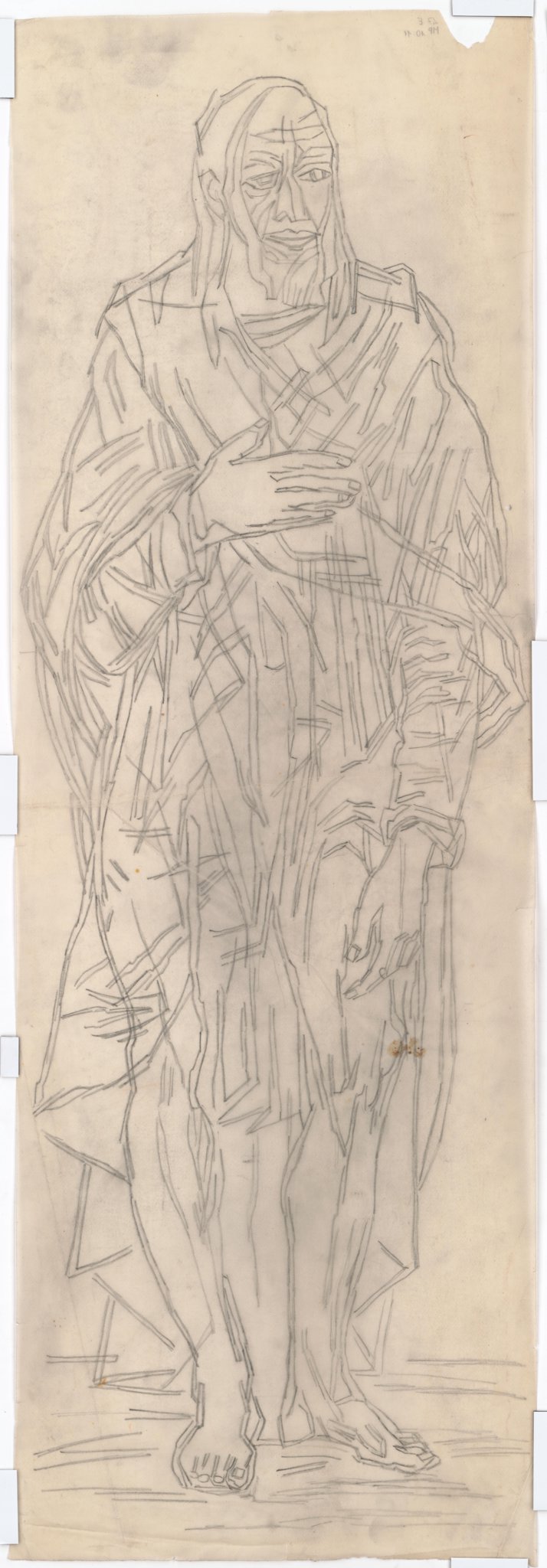 Ce travail préparatoire a été réalisé dans le cadre d'une commande de vitraux pour l'église Saint-Sigismond de Saint-Maurice en Valais. L'église ayant besoin d'être restaurée, le chanoine Louis Poncet propose à son frère de se charger de la réalisation de nouveaux vitraux, afin de remplacer les anciennes verrières du XIXème. La Paroisse disposant de peu de moyens, Marcel Poncet obtient un subside de la fondation Gleyre pour la réalisation de huit vitraux sur le thème des Prophètes. Les quatre premiers vitraux sont posés au cours de l'année 1944, et reçoivent des échos très positifs dans la presse. Les quatre derniers sont réalisés au cours de l'année 1946, et inaugurés en juin 1947. En 1960, les vitraux, alors jugés trop sombres pour la nef, ont été déplacés dans le choeur, superposés les uns au-dessus des autres. Ceux-ci n'ont retrouvé leur emplacement d'origine qu'en 2001, grâce à l'entremise de Jean-Pierre Coutaz, auteur des vitraux actuels du choeur. Ces oeuvres, qui jouent à la fois sur d'audacieux jeux de couleur et une grisaille abondante, semblent condenser les expériences antérieures de Marcel Poncet dans un nouvel équilibre entre ses métiers de peintre et de verrier. Les vitraux de Saint-Sigismond figurent, avec ceux de Saint-Paul de Grange-Canal et les quatre Evangélistes de la cathédrale de Lausanne, parmi ses réalisations les plus célèbres (NOVERRAZ, 2014, pp. 80-88 ; REYMOND, 1992, pp. 79, 108-112, 173-175 ; Dossier "Vitraux, Eglise Saint-Sigismond, Saint-Maurice, 1941-1947", boîte "VITRAUX II, 1932-1947", fonds Poncet, Vitrocentre Romont).