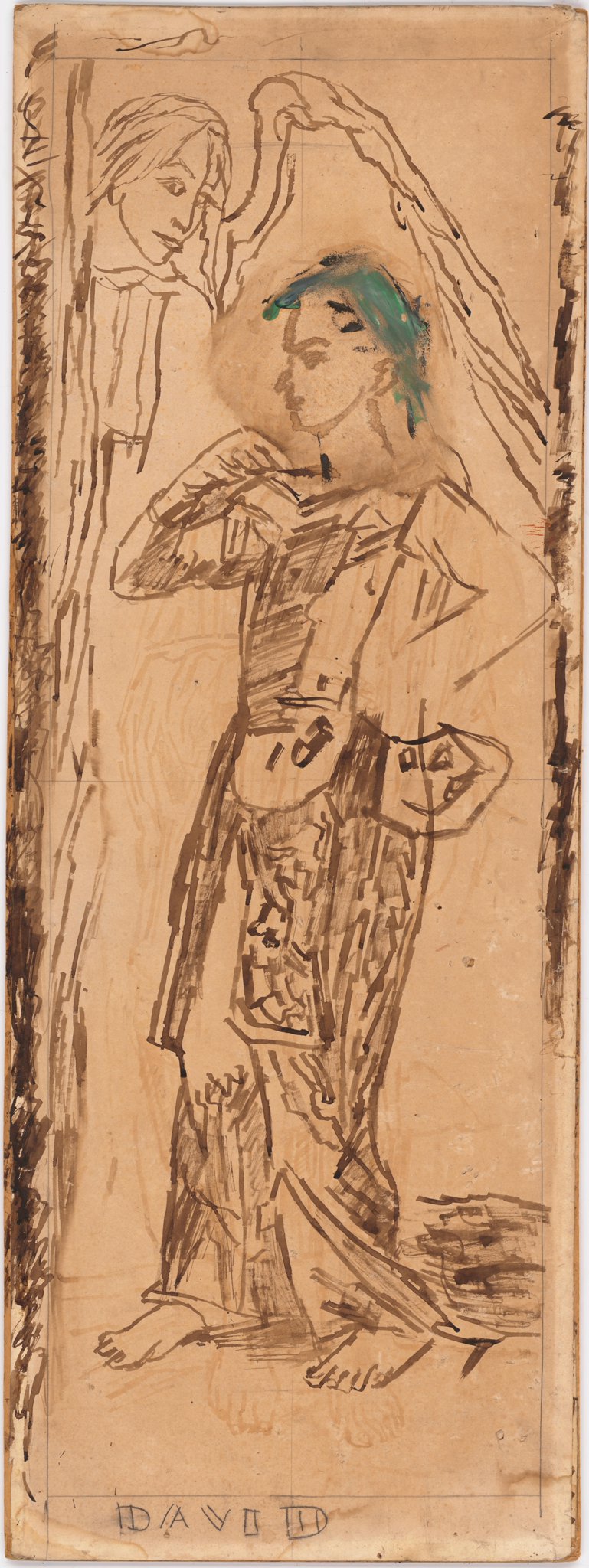 Ce projet, très proche du vitrail de Daniel réalisé pour Neuchâtel, pourrait être une première ébauche de ce personnage, qu'il prévoyait tout d'abord comme David, d'où l'inscription dans la marge.