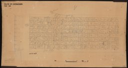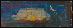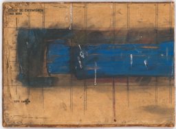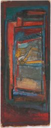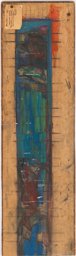 Composition juxtaposant diverses plages colorées, dans des tons verts et mauves, traversées d'un réseau de lignes droites s'entrecoupant. Une grande ligne jaune verticale traverse le centre de la composition.