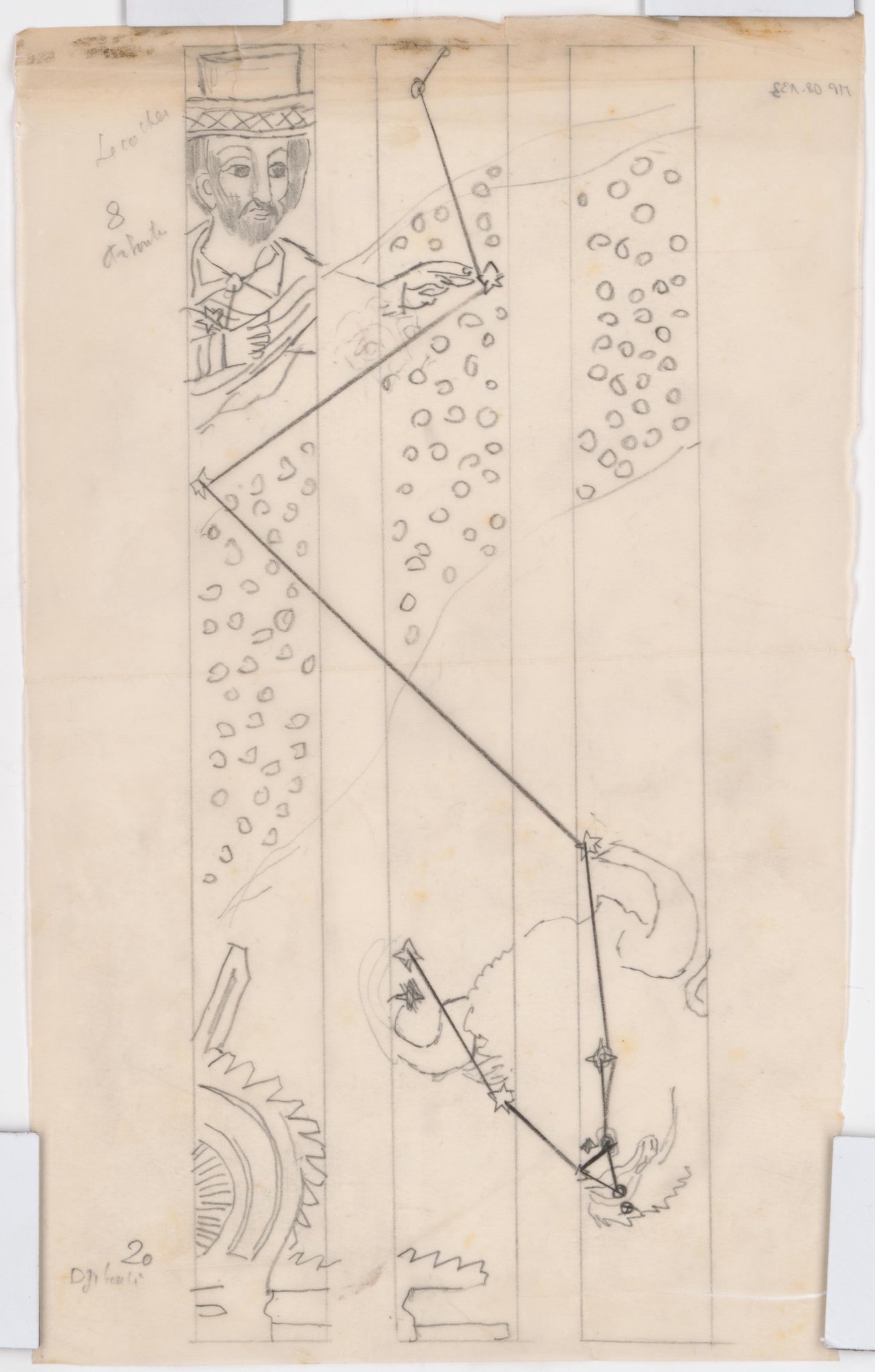 Ce travail préparatoire peut probablement être rattaché à une commande de l'architecte W. Henauer à Marcel Poncet pour les vitraux de sa nouvelle église de Wollishofen en 1937 (Reymond, 1992, p. 170), qui ne seront pas réalisés pour des raisons inconnues. Deux projets représentant 17 fenêtres sur le thème des cartes du ciel avec des inscriptions en allemand et la date de 1937 (MP 08.58 et MP 08.176), ont pu être attribués à cette commande. C'est sur la base de ces travaux très détaillés que le corpus des oeuvres préparatoires pouvant y être rattachées a pu être établi.