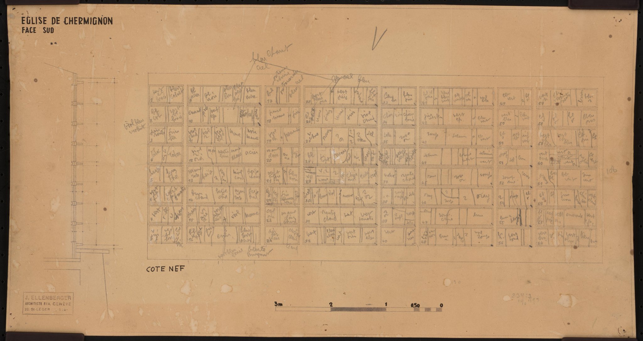 Alors que Poncet est en plein achèvement des vitraux de la collégiale de Neuchâtel, l'architecte Jean-Marie Ellenberger fait appel à lui pour collaborer à sa nouvelle église qu'il termine à Chermignon. Cette construction moderne pose un problème de choix au verrier, puisqu'il faudrait couvrir de verre des surfaces de 30 mètres de longs sur 3 mètres de haut, correspondant aux deux parois hautes de la nef. Poncet doit donc réfléchir à des solutions nouvelles, du fait de la vaste surface à recouvrir. "Avec ces immenses vides et ces vitrages légers (...) nous avons une masse énorme de lumière à contenir." Cf : Lettre de Poncet à Ellenberger, du 6 mars 1952. Le vitrail prend alors une importance jamais égalée dans aucune autre église dans laquelle Poncet a travaillé. Autant que le toit ou les murs, les vitraux seront l'âme du bâtiment. Les deux hommes imaginent une église complètement baignée de lumière tel un "grand arc en ciel qui finirait en gloire vers le choeur". Cf : Lettre de Ellenberger à Poncet, 11 juillet 1951. Pour les fenêtres hautes, ils envisagent le thème de "la Création du monde", et des verrières non figuratives pour les bas-côtés du choeur, pour des raisons avant tout économiques. La réalisation de ces immenses surfaces de verre nécessitant un coût très élevé, Poncet s'adresse donc à nouveau à la fondation Gleyre, pour financer une partie du projet. La somme versée est cependant plus un appoint qui permet à Poncet de subsister pendant la réalisation des verrières non figuratives des bas-côtés à droite et à gauche du choeur, posées avant la fin de l'année 1952. La question financière sera extrêmement présente tout au long de la réalisation, donnant lieu à des retards et créant des litiges qui mèneront finalement l'Abbé Charles Mayor a mettre abruptement fin au projet en octobre 1952. Poncet a cependant déjà réalisé des esquisses en grandeur et des maquettes pour la partie sud sur la "Création du monde", fournissant de précieuses informations sur son projet. L'artiste n'aura au final, sur ce prodigieux ensemble, réalisé que les deux verrières décoratives des bas-côtés. Il n'achèvera jamais la "Création du monde", dont l'exécution devait être "remise à plus tard", puisqu'il décède d'une crise cardiaque en juin 1953. C'est Jean-Claude Morend qui compléta l'ensemble des vitraux de la nef, en 1986 (NOVERRAZ, 2014, pp. 97-104 ; REYMOND, 1992, pp. 112-115, 177 ; Dossier "Vitraux Chermignon / Correspondance officielle, 1952-1953", boîte "VITRAUX II, 1948-1953", archives Poncet, Vitrocentre Romont).