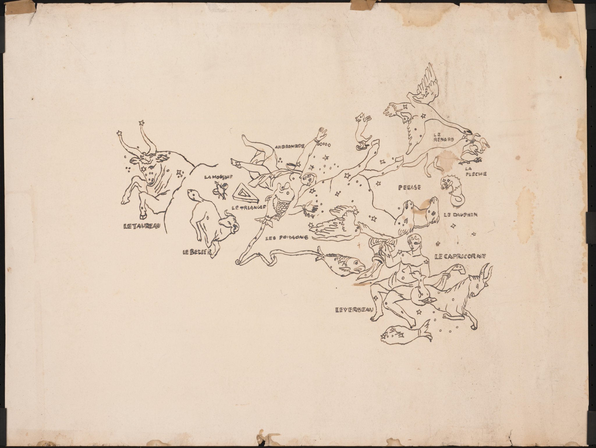 Projet pour les vitraux sur le thème de la "carte du ciel" : ensemble des personnifications des constellations et signes du zodiaque suivant leur position dans le ciel. De gauche à droite : le Taureau, la Mouche, le Bélier, le Triangle, Andromède, les Poissons, Pégase, le Cygne, le Renard, la Flèche, le Dauphin, le Capricorne, le Verseau, parsemés d'étoiles.