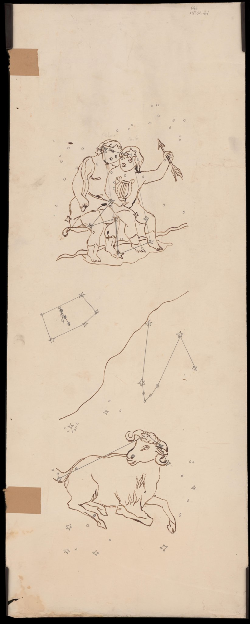 Projet pour les vitraux sur le thème de la "carte du ciel": les personnifications des signes du zodiaque, les Gémeaux en haut, et le Bélier en bas, et quelques tracés de constellations.