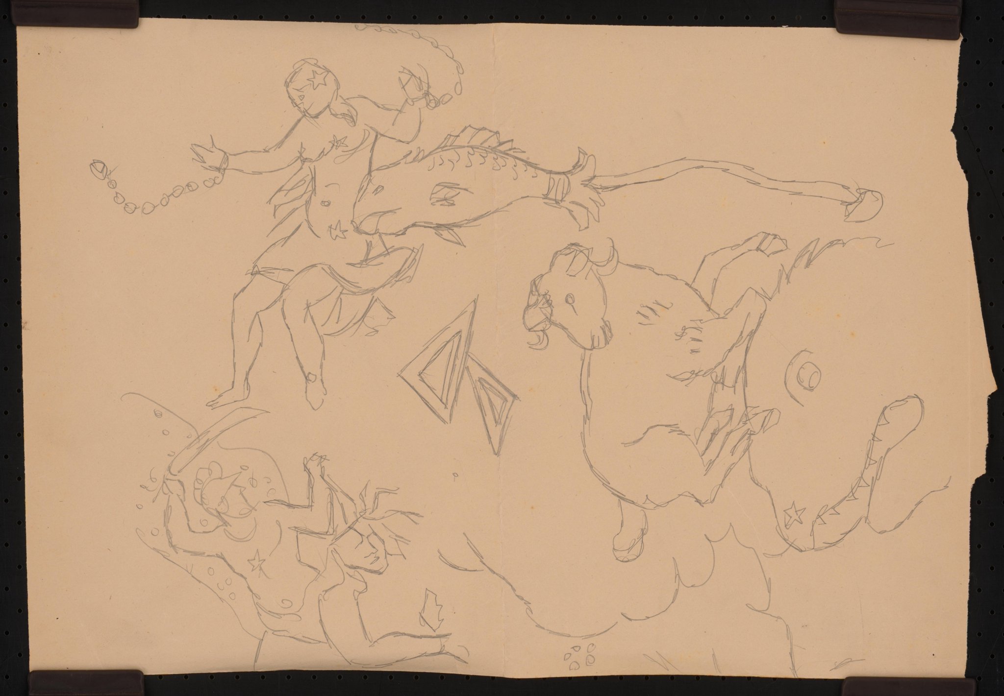 Projet pour les vitraux sur le thème de la "carte du ciel": personnification de plusieurs signes zodiacaux et constellations représentés pêle-mêle. De gauche à droite : la Vierge (?), les Poissons, Orion (?), la constellation du Triangle, le Bélier, l'Hydre (?).