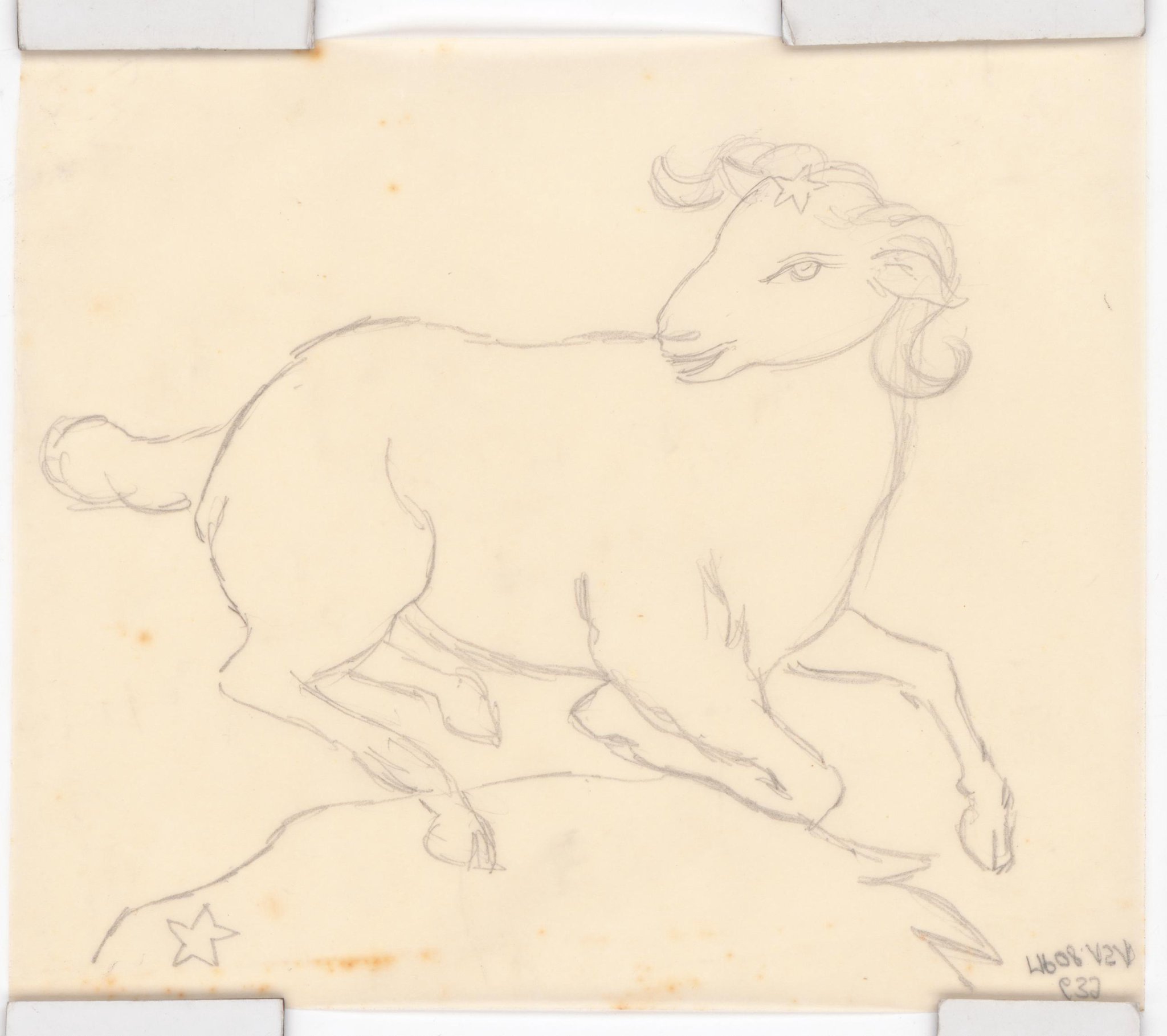 Projet pour les vitraux sur le thème de la "carte du ciel": personnification du signe du Bélier, représenté couché avec une petite étoile sur le front, une sorte de rocher esquissé en dessous de lui.