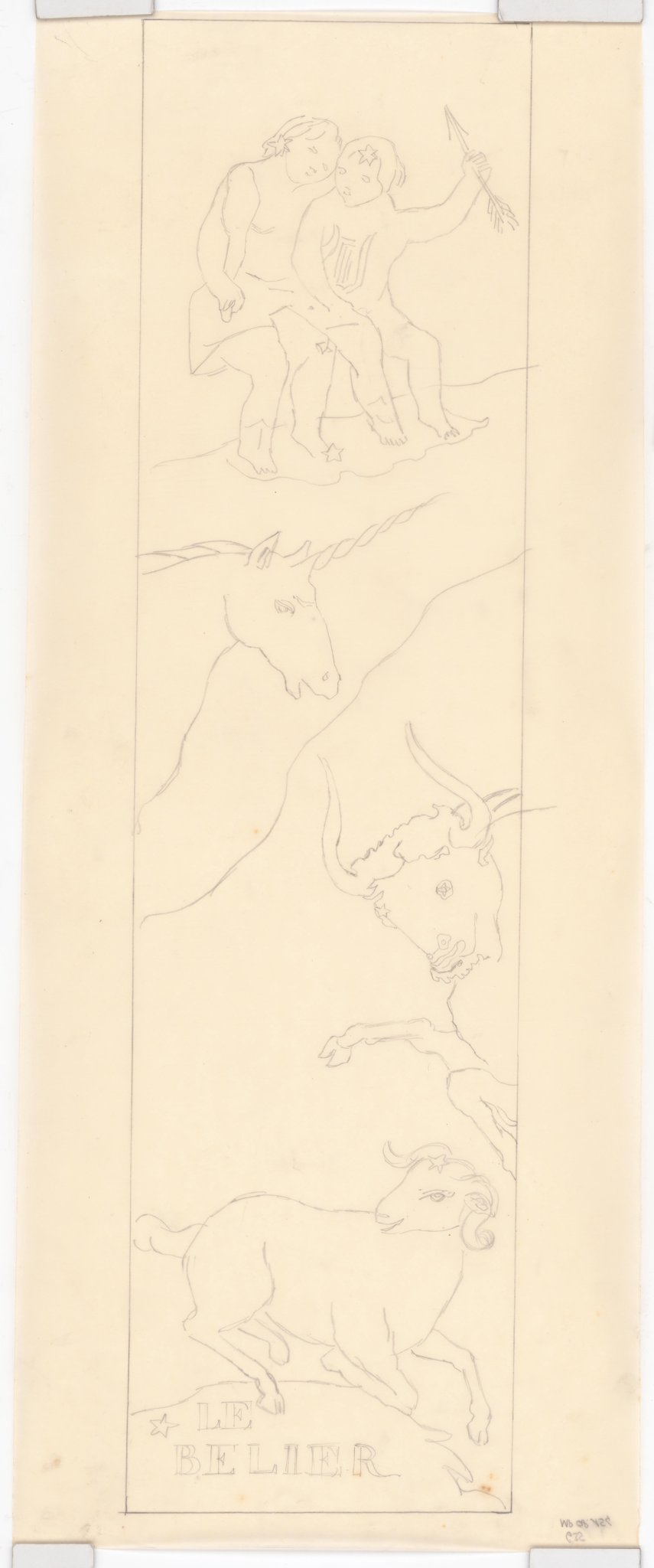 Projet pour les vitraux sur le thème de la "carte du ciel": personnification de plusieurs signes astrologiques et constellations. De bas en haut : les Gémeaux, assis côte à côte, celui de droite tenant une flèche et une lyre, la Licorne, dont seul le buste est représenté de profil, le Taureau, dont seul le buste et les pattes sont esquissés et le Bélier, couché sur une sorte de formation rocheuse avec une petite étoile sur le front.